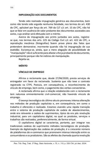 Rev. Trib. Reg. Trab. 3ª Reg., Belo Horizonte, v. 70, n. 110, p. 535-734, jul./dez. 2024720IMPUGNAÇÃO AOS DOCUMENTOSTendo sido realizada impugnação genérica aos documentos, bem como não tendo sido arguida nenhuma falsidade, nos termos do art. 430 do CPC, aplicável por força do art. 769 da CLT c/c art. 15 do CPC, não há que se falar em ausência de valor probante dos documentos acostados aos autos, cuja análise será efetuada com o mérito.Acerca da impugnação aos prints juntados aos autos, registrese que, nos termos dos arts. 225 do Código Civil c/c art. 422 do CPC, a reprodução mecânica (fotografias) fazem prova plena dos fatos que pretendem demonstrar, mormente quando não há impugnação de sua exatidão. Esclareça-se, ainda, que a mera alegação de possibilidade de “manipulação” não é suficiente para afastar a força probante do documento, principalmente porque não há indícios de manipulação.Rejeita-se.MÉRITOVÍNCULO DE EMPREGOAfirma o reclamante que, desde 27/04/2020, presta serviços de entregador em favor da reclamada. Sustenta que não teve o contrato registrado na CTPS. Postula, em consequência, o reconhecimento do vínculo de emprego, bem como, o pagamento das verbas consectárias.A reclamada afirma que a relação estabelecida com o reclamante tem natureza eminentemente civil-comercial, não havendo vínculo de emprego.O avanço tecnológico do último século promoveu intensa alteração nos métodos de produção capitalista e, em consequência, em como o trabalho é oferecido e realizado. Estamos vivendo uma rápida transição entre o sistema de produção capitalista de cadeia de abastecimentos, onde era relevante a cadeia de suprimentos, típico da era pós revolução industrial, para um capitalismo digital, no qual os produtos, serviços e trabalhos são realizados, preferencialmente, de forma virtual.O capitalismo digital se caracteriza, portanto, por integrar nas tradicionais cadeias de suprimento métodos tecnológicos de produção. Exemplo da digitalização das cadeias de produção, é o crescente número de plataformas de e-commerce que promovem intensa interação entre os consumidores e os produtores. São os efeitos da chamada quarta revolução