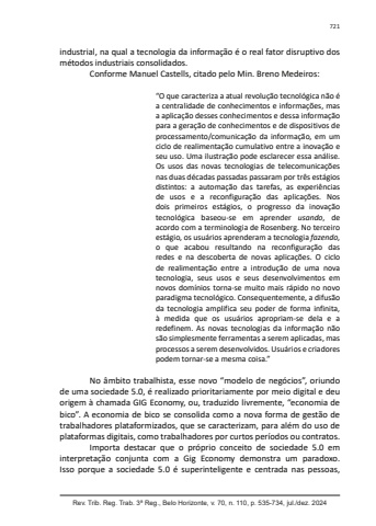 Rev. Trib. Reg. Trab. 3ª Reg., Belo Horizonte, v. 70, n. 110, p. 535-734, jul./dez. 2024721industrial, na qual a tecnologia da informação é o real fator disruptivo dos métodos industriais consolidados.Conforme Manuel Castells, citado pelo Min. Breno Medeiros:“O que caracteriza a atual revolução tecnológica não é a centralidade de conhecimentos e informações, mas a aplicação desses conhecimentos e dessa informação para a geração de conhecimentos e de dispositivos de processamento/comunicação da informação, em um ciclo de realimentação cumulativo entre a inovação e seu uso. Uma ilustração pode esclarecer essa análise. Os usos das novas tecnologias de telecomunicações nas duas décadas passadas passaram por três estágios distintos: a automação das tarefas, as experiências de usos e a reconfiguração das aplicações. Nos dois primeiros estágios, o progresso da inovação tecnológica baseou-se em aprender usando, de acordo com a terminologia de Rosenberg. No terceiro estágio, os usuários aprenderam a tecnologia fazendo, o que acabou resultando na reconfiguração das redes e na descoberta de novas aplicações. O ciclo de realimentação entre a introdução de uma nova tecnologia, seus usos e seus desenvolvimentos em novos domínios torna-se muito mais rápido no novo paradigma tecnológico. Consequentemente, a difusão da tecnologia amplifica seu poder de forma infinita, à medida que os usuários apropriam-se dela e a redefinem. As novas tecnologias da informação não são simplesmente ferramentas a serem aplicadas, mas processos a serem desenvolvidos. Usuários e criadores podem tornar-se a mesma coisa.”No âmbito trabalhista, esse novo “modelo de negócios”, oriundo de uma sociedade 5.0, é realizado prioritariamente por meio digital e deu origem à chamada GIG Economy, ou, traduzido livremente, “economia de bico”. A economia de bico se consolida como a nova forma de gestão de trabalhadores plataformizados, que se caracterizam, para além do uso de plataformas digitais, como trabalhadores por curtos períodos ou contratos.Importa destacar que o próprio conceito de sociedade 5.0 em interpretação conjunta com a Gig Economy demonstra um paradoxo. Isso porque a sociedade 5.0 é superinteligente e centrada nas pessoas,