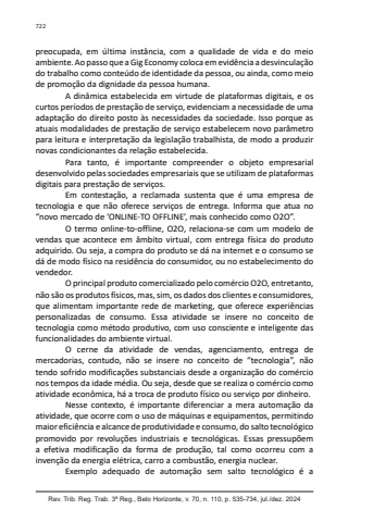 Rev. Trib. Reg. Trab. 3ª Reg., Belo Horizonte, v. 70, n. 110, p. 535-734, jul./dez. 2024722preocupada, em última instância, com a qualidade de vida e do meio ambiente. Ao passo que a Gig Economy coloca em evidência a desvinculação do trabalho como conteúdo de identidade da pessoa, ou ainda, como meio de promoção da dignidade da pessoa humana.A dinâmica estabelecida em virtude de plataformas digitais, e os curtos períodos de prestação de serviço, evidenciam a necessidade de uma adaptação do direito posto às necessidades da sociedade. Isso porque as atuais modalidades de prestação de serviço estabelecem novo parâmetro para leitura e interpretação da legislação trabalhista, de modo a produzir novas condicionantes da relação estabelecida.Para tanto, é importante compreender o objeto empresarial desenvolvido pelas sociedades empresariais que se utilizam de plataformas digitais para prestação de serviços.Em contestação, a reclamada sustenta que é uma empresa de tecnologia e que não oferece serviços de entrega. Informa que atua no “novo mercado de ‘ONLINE-TO OFFLINE’, mais conhecido como O2O”.O termo online-to-offline, O2O, relaciona-se com um modelo de vendas que acontece em âmbito virtual, com entrega física do produto adquirido. Ou seja, a compra do produto se dá na internet e o consumo se dá de modo físico na residência do consumidor, ou no estabelecimento do vendedor.O principal produto comercializado pelo comércio O2O, entretanto, não são os produtos físicos, mas, sim, os dados dos clientes e consumidores, que alimentam importante rede de marketing, que oferece experiências personalizadas de consumo. Essa atividade se insere no conceito de tecnologia como método produtivo, com uso consciente e inteligente das funcionalidades do ambiente virtual.O cerne da atividade de vendas, agenciamento, entrega de mercadorias, contudo, não se insere no conceito de “tecnologia”, não tendo sofrido modificações substanciais desde a organização do comércio nos tempos da idade média. Ou seja, desde que se realiza o comércio como atividade econômica, há a troca de produto físico ou serviço por dinheiro.Nesse contexto, é importante diferenciar a mera automação da atividade, que ocorre com o uso de máquinas e equipamentos, permitindo maior eficiência e alcance de produtividade e consumo, do salto tecnológico promovido por revoluções industriais e tecnológicas. Essas pressupõem a efetiva modificação da forma de produção, tal como ocorreu com a invenção da energia elétrica, carro a combustão, energia nuclear.Exemplo adequado de automação sem salto tecnológico é a