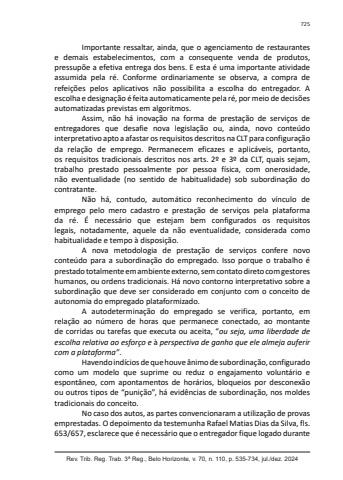 Rev. Trib. Reg. Trab. 3ª Reg., Belo Horizonte, v. 70, n. 110, p. 535-734, jul./dez. 2024725Importante ressaltar, ainda, que o agenciamento de restaurantes e demais estabelecimentos, com a consequente venda de produtos, pressupõe a efetiva entrega dos bens. E esta é uma importante atividade assumida pela ré. Conforme ordinariamente se observa, a compra de refeições pelos aplicativos não possibilita a escolha do entregador. A escolha e designação é feita automaticamente pela ré, por meio de decisões automatizadas previstas em algoritmos.Assim, não há inovação na forma de prestação de serviços de entregadores que desafie nova legislação ou, ainda, novo conteúdo interpretativo apto a afastar os requisitos descritos na CLT para configuração da relação de emprego. Permanecem eficazes e aplicáveis, portanto, os requisitos tradicionais descritos nos arts. 2º e 3º da CLT, quais sejam, trabalho prestado pessoalmente por pessoa física, com onerosidade, não eventualidade (no sentido de habitualidade) sob subordinação do contratante.Não há, contudo, automático reconhecimento do vínculo de emprego pelo mero cadastro e prestação de serviços pela plataforma da ré. É necessário que estejam bem configurados os requisitos legais, notadamente, aquele da não eventualidade, considerada como habitualidade e tempo à disposição.A nova metodologia de prestação de serviços confere novo conteúdo para a subordinação do empregado. Isso porque o trabalho é prestado totalmente em ambiente externo, sem contato direto com gestores humanos, ou ordens tradicionais. Há novo contorno interpretativo sobre a subordinação que deve ser considerado em conjunto com o conceito de autonomia do empregado plataformizado.A autodeterminação do empregado se verifica, portanto, em relação ao número de horas que permanece conectado, ao montante de corridas ou tarefas que executa ou aceita, “ou seja, uma liberdade de escolha relativa ao esforço e à perspectiva de ganho que ele almeja auferir com a plataforma”.Havendo indícios de que houve ânimo de subordinação, configurado como um modelo que suprime ou reduz o engajamento voluntário e espontâneo, com apontamentos de horários, bloqueios por desconexão ou outros tipos de “punição”, há evidências de subordinação, nos moldes tradicionais do conceito.No caso dos autos, as partes convencionaram a utilização de provas emprestadas. O depoimento da testemunha Rafael Matias Dias da Silva, fls. 653/657, esclarece que é necessário que o entregador fique logado durante