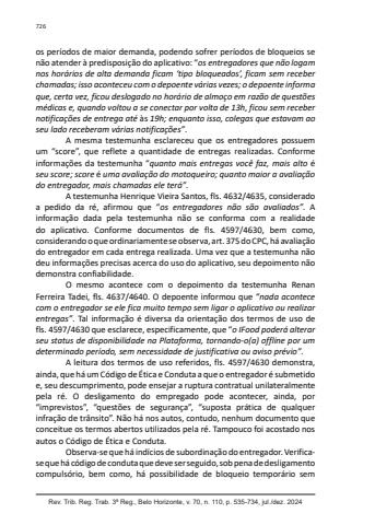 Rev. Trib. Reg. Trab. 3ª Reg., Belo Horizonte, v. 70, n. 110, p. 535-734, jul./dez. 2024726os períodos de maior demanda, podendo sofrer períodos de bloqueios se não atender à predisposição do aplicativo: “os entregadores que não logam nos horários de alta demanda ficam ‘tipo bloqueados’, ficam sem receber chamadas; isso aconteceu com o depoente várias vezes; o depoente informa que, certa vez, ficou deslogado no horário de almoço em razão de questões médicas e, quando voltou a se conectar por volta de 13h, ficou sem receber notificações de entrega até às 19h; enquanto isso, colegas que estavam ao seu lado receberam várias notificações”.A mesma testemunha esclareceu que os entregadores possuem um “score”, que reflete a quantidade de entregas realizadas. Conforme informações da testemunha “quanto mais entregas você faz, mais alto éseu score; score é uma avaliação do motoqueiro; quanto maior a avaliação do entregador, mais chamadas ele terá”.A testemunha Henrique Vieira Santos, fls. 4632/4635, considerado a pedido da ré, afirmou que “os entregadores não são avaliados”. A informação dada pela testemunha não se conforma com a realidade do aplicativo. Conforme documentos de fls. 4597/4630, bem como, considerando o que ordinariamente se observa, art. 375 do CPC, há avaliação do entregador em cada entrega realizada. Uma vez que a testemunha não deu informações precisas acerca do uso do aplicativo, seu depoimento não demonstra confiabilidade.O mesmo acontece com o depoimento da testemunha Renan Ferreira Tadei, fls. 4637/4640. O depoente informou que “nada acontece com o entregador se ele fica muito tempo sem ligar o aplicativo ou realizar entregas”. Tal informação é diversa da orientação dos termos de uso de fls. 4597/4630 que esclarece, especificamente, que “o IFood poderá alterar seu status de disponibilidade na Plataforma, tornando-o(a) offline por um determinado período, sem necessidade de justificativa ou aviso prévio”.A leitura dos termos de uso referidos, fls. 4597/4630 demonstra, ainda, que há um Código de Ética e Conduta a que o entregador é submetido e, seu descumprimento, pode ensejar a ruptura contratual unilateralmente pela ré. O desligamento do empregado pode acontecer, ainda, por “imprevistos”, “questões de segurança”, “suposta prática de qualquer infração de trânsito”. Não há nos autos, contudo, nenhum documento que conceitue os termos abertos utilizados pela ré. Tampouco foi acostado nos autos o Código de Ética e Conduta.Observa-se que há indícios de subordinação do entregador. Verificase que há código de conduta que deve ser seguido, sob pena de desligamento compulsório, bem como, há possibilidade de bloqueio temporário sem