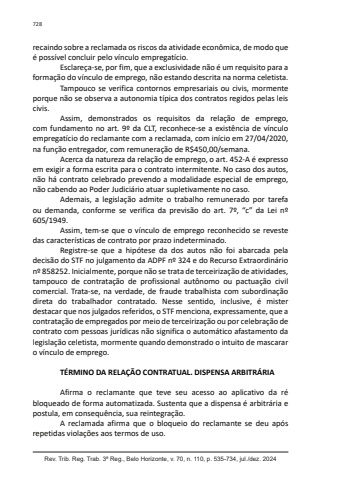Rev. Trib. Reg. Trab. 3ª Reg., Belo Horizonte, v. 70, n. 110, p. 535-734, jul./dez. 2024728recaindo sobre a reclamada os riscos da atividade econômica, de modo que é possível concluir pelo vínculo empregatício.Esclareça-se, por fim, que a exclusividade não é um requisito para a formação do vínculo de emprego, não estando descrita na norma celetista.Tampouco se verifica contornos empresariais ou civis, mormente porque não se observa a autonomia típica dos contratos regidos pelas leis civis.Assim, demonstrados os requisitos da relação de emprego, com fundamento no art. 9º da CLT, reconhece-se a existência de vínculo empregatício do reclamante com a reclamada, com início em 27/04/2020, na função entregador, com remuneração de R$450,00/semana.Acerca da natureza da relação de emprego, o art. 452-A é expresso em exigir a forma escrita para o contrato intermitente. No caso dos autos, não há contrato celebrado prevendo a modalidade especial de emprego, não cabendo ao Poder Judiciário atuar supletivamente no caso.Ademais, a legislação admite o trabalho remunerado por tarefa ou demanda, conforme se verifica da previsão do art. 7º, “c” da Lei nº 605/1949.Assim, tem-se que o vínculo de emprego reconhecido se reveste das características de contrato por prazo indeterminado.Registre-se que a hipótese da dos autos não foi abarcada pela decisão do STF no julgamento da ADPF nº 324 e do Recurso Extraordinário nº 858252. Inicialmente, porque não se trata de terceirização de atividades, tampouco de contratação de profissional autônomo ou pactuação civil comercial. Trata-se, na verdade, de fraude trabalhista com subordinação direta do trabalhador contratado. Nesse sentido, inclusive, é mister destacar que nos julgados referidos, o STF menciona, expressamente, que a contratação de empregados por meio de terceirização ou por celebração de contrato com pessoas jurídicas não significa o automático afastamento da legislação celetista, mormente quando demonstrado o intuito de mascarar o vínculo de emprego.TÉRMINO DA RELAÇÃO CONTRATUAL. DISPENSA ARBITRÁRIAAfirma o reclamante que teve seu acesso ao aplicativo da ré bloqueado de forma automatizada. Sustenta que a dispensa é arbitrária e postula, em consequência, sua reintegração.A reclamada afirma que o bloqueio do reclamante se deu após repetidas violações aos termos de uso.