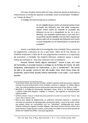 73Rev. Trib. Reg. Trab. 3ª Reg., Belo Horizonte, v. 70, n. 110, p. 65-96, jul./dez. 2024Por isso, há pelo menos dois mil anos, diversos povos já atribuíam a entes divinos a missão de apontar a verdade. Eram as chamadas “Ordálias” ou “Juízos de Deus”11.O Código de Hammurabi já as conhecia:Se um cidadão lançou contra um (outro) awilum (uma acusação de) feitiçaria mas não pôde comprovar: aquele contra quem foi lançada (a acusação de) feitiçaria irá ao rio e mergulhará no rio. Se o rio o dominar, seu acusador tomará para si sua casa. Se o rio purificar aquele cidadão e ele sair ileso: aquele que lançou sobre ele (a acusação de) feitiçaria será morto e o que mergulhou no rio tomará para si a casa de seu acusador12.Assim, a verdade não era investigada, mas revelada; Deus, presente ao julgamento, ordenava ao rio o que fazer. Além da fé nos deuses, as Ordálias traduziam a falta de fé nos julgamentos humanos e a esperança de encontrar a Verdade. No Império Romano, cederam passo a outros meios de conhecê-la - mas elas voltaram com os bárbaros.Amaral Santos relata alguns exemplos13. Assim é que, em caso de homicídio, o acusado tocava o umbigo ou as feridas do morto. Se este sangrasse, esbravejasse ou espumasse, o juiz o condenava14. Na prova do pão e do queijo, comia-se até não poder mais. Num fosso cheio de serpentes, quem fosse picado estaria atestando a sua culpa - e já estaria punido.11 As próximas linhas, que trata das Ordálias, também reproduz texto que escrevi: Aspectos curiosos da prova testemunhal: entre verdades, mentiras e enganos. In: VIANA, Márcio Túlio. Dos ardis do futebol à prova testemunhal. Belo Horizonte: RTM, 2018, p. 51/87. 12 BOUZON, E. O Código de Hammurabi. Petrópolis: Vozes, 1976, p. 25. No texto original, a palavra usada para designar “cidadão” é “awilum”, que segundo os dicionários tem aquele sentido. 13 SANTOS, Moacir Amaral. Tratado da prova judiciária no cível e no comercial. Tomo I. São Paulo: Max Limonad, 1952. 14 Note-se que, depois de afogamentos, os cadáveres costumam espumar; e quando já entrando em processo de decomposição, apresentam gases, o que os faz emitir ruídos que podem talvez ser confundidos com um “esbravejar” (colaboração dos alunos médicos Guilherme Augusto Carvalho Salgado, João Paulo Fonseca Nunes, Juliana Silva Souto Rocha e Thiago Goulart Lovalho, matriculados em 2009 na turma do 8º período de Direito do Trabalho da UFMG, e aos quais agradeço).