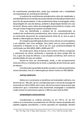 Rev. Trib. Reg. Trab. 3ª Reg., Belo Horizonte, v. 70, n. 110, p. 535-734, jul./dez. 2024731de recolhimento previdenciário, ainda que realizado sob a modalidade correspondente ao contribuinte individual.A ausência de recolhimento previdenciário retira do trabalhador a possibilidade de ver acrescidos ao seu período de contribuição previdenciária para fins de aposentadoria. O não recolhimento deixa o empregado, ainda, desprotegido em caso de doença, acidente e desproteção familiar em caso de morte. Nesses casos o dano ao empregado é presumido (in re ipsa), uma vez que enseja insegurança quanto à proteção social.Uma vez identificada a conduta da ré, consubstanciada na ausência de recolhimento previdenciário, bem como a presunção de dano ao reclamante decorrente do comportamento ilícito da ré, tem-se que é devida a indenização por danos morais.Em relação à quantificação do dano moral, não há um norte objetivo a ser adotado, nem uma tarifação. Para tanto, tem-se como parâmetro orientativo o disposto no art. 223-G da CLT, cuja constitucionalidade foi confirmada nas ADIs 6050, 6082 e 6069 pelo STF.Em sendo assim, deve-se buscar, entre outros critérios, compensar o sofrimento da vítima verificando a extensão do dano (artigo 944 do CC), o grau de culpa do ofensor, a sua situação econômica, bem como as peculiaridades do caso em análise.Devem-se levar em consideração, ainda, o não enriquecimento ilícito da vítima e a tentativa de se evitar a repetição do ato ilícito por parte do ofensor.Considerando a gravidade da lesão causada e os demais parâmetros acima elencados, fixa-se a indenização por danos morais em R$5.000,00.JUSTIÇA GRATUITADefere-se à reclamante os benefícios da Gratuidade Judiciária, nos termos do art. 790, §3º, da CLT, considerando que o vínculo de emprego foi encerrado em 26/11/2023, bem como, não há nos autos outras provas que evidenciem que a reclamante está atualmente empregado e recebendo renda mensal em percentual superior a 40% do valor teto do INSS.HONORÁRIOS ADVOCATÍCIOSConsiderando os critérios previstos no art. 791-A, 2º, da CLT, arbitra-se os honorários sucumbenciais em 10% dos valores atualizados dos pedidos julgados procedentes, a serem apurados em liquidação, devidos