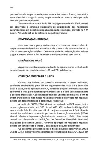 Rev. Trib. Reg. Trab. 3ª Reg., Belo Horizonte, v. 70, n. 110, p. 535-734, jul./dez. 2024732pela reclamada ao patrono da parte autora. Da mesma forma, honorários sucumbenciais a cargo do autor, ao patrono da reclamada, no importe de 10% dos pedidos rejeitados.Tendo em vista a decisão do STF no julgamento da ADI 5766, deverá ser observada a condição suspensiva de exigibilidade dos honorários sucumbenciais em benefício dos advogados da reclamada, prevista no § 4º do art. 791-A da CLT ao beneficiário da justiça gratuita.COMPENSAÇÃO - DEDUÇÃOUma vez que a parte reclamante e a parte reclamada não são respectivamente devedoras e credoras de parcelas de cunho trabalhista, não há compensação a deferir. Defere-se, todavia, a dedução dos valores pagos a mesmo título, a fim de evitar o enriquecimento sem causa.LITIGÂNCIA DE MÁ-FÉAs partes se utilizaram do seu direito de ação sem que tenha havido demonstração das condutas do art. 80 do CPC. Indefere-se.CORREÇÃO MONETÁRIA E JUROSQuanto aos índices de correção monetária a serem utilizados, conforme estabelecido pelo STF no julgamento das ADCs 58 e 59 e ADIs 5867 e 6021, serão aplicados o IPCA, acrescido de juros mensais apurados conforme a TRD, para o período pré processual, e a taxa Selic Receita para o período processual. A Selic Receita deve ser utilizada como juros, a fim de evitar anatocismos. Nos meses nos quais o índice de correção for negativo, deverá ser desconsiderado o percentual respectivo.A partir de 30/08/2024, deverá ser aplicado o IPCA como índice de correção monetária, art. 389 c/c art. 406, §1º, ambos do Código Civil, acrescido da Selic Receita para cálculo de juros moratórios. A Selic Receita deverá ter excluído o montante pertinente à correção monetária (IPCA), visando afastar a dupla correção incidente no mesmo crédito. Para tanto, deverá ser observada as definições do Conselho Monetário Nacional, divulgadas pelo Banco Central. Havendo apuração de resultado negativo, deverá ser considerado o índice 0 para cálculo de juros do período.Os descontos previdenciários e fiscais deverão observar a Súmula 368 do C. TST, inclusive com as alterações efetuadas no dia 16/04/2012, em