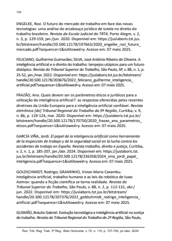 738Rev. Trib. Reg. Trab. 3ª Reg., Belo Horizonte, v. 70, n. 110, p. 737-740, jul./dez. 2024ENGELKE, Rozi. O futuro do mercado de trabalho em face das novas tecnologias: uma análise do arcabouço jurídico de tutela no direito do trabalho brasileiro. Revista da Escola Judicial do TRT4, Porto Alegre, v. 2, n. 3, p. 129-159, jan./jun. 2020. Disponível em: https://juslaboris.tst.jus.br/bitstream/handle/20.500.12178/197663/2020_engelke_rozi_futuro_mercado.pdf?sequence=1&isAllowed=y. Acesso em: 07 maio 2025.FELICIANO, Guilherme Guimarães; SILVA, José Antônio Ribeiro de Oliveira. A inteligência artificial e o direito do trabalho: lampejos utópicos para um futuro distópico. Revista do Tribunal Superior do Trabalho, São Paulo, SP, v. 88, n. 1, p. 25-52, jan./mar. 2022. Disponível em: https://juslaboris.tst.jus.br/bitstream/handle/20.500.12178/203676/2022_feliciano_guilherme_inteligencia_artificial.pdf?sequence=1&isAllowed=y. Acesso em: 07 maio 2025.FRAZÃO, Ana. Quais devem ser os parâmetros éticos e jurídicos para a utilização da inteligência artificial?: as respostas oferecidas pelas recentes diretrizes da União Europeia para a inteligência artificial confiável. Revista eletrônica [do] Tribunal Regional do Trabalho da 9ª Região, Curitiba, v. 9, n. 86, p. 119-124, mar. 2020. Disponível em: https://juslaboris.tst.jus.br/bitstream/handle/20.500.12178/170750/2020_frazao_ana_parametros_eticos.pdf?sequence=1&isAllowed=y. Acesso em: 07 maio 2025.GARCÍA VIÑA, Jordi. El papel de la inteligencia artificial como herramienta de la inspección de trabajo y de la seguridad social en la lucha contra los accidentes de trabajo en España. Revista trabalho, direito e justiça, Curitiba, v. 2, n. 1, p. 185-207, jan./abr. 2024. Disponível em: https://juslaboris.tst.jus.br/bitstream/handle/20.500.12178/236358/2024_vina_jordi_papel_inteligencia.pdf?sequence=1&isAllowed=y. Acesso em: 07 maio 2025.GOLDSCHMIDT, Rodrigo; GRAMINHO, Vivian Maria Caxambu. Inteligência artificial, trabalho humano e as leis da robótica de Isaac Asimov: quando a ficção científica se torna realidade. Revista do Tribunal Superior do Trabalho, São Paulo, v. 88, n. 2, p. 112-131, abr./jun. 2022. Disponível em: https://juslaboris.tst.jus.br/bitstream/handle/20.500.12178/207376/2022_goldschmidt_rodrigo_inteligencia_artificial.pdf?sequence=1&isAllowed=y. Acesso em: 07 maio 2025.GUSMÃO, Bráulio Gabriel. Evolução tecnológica e inteligência artificial na Justiça do trabalho. Revista do Tribunal Regional do Trabalho da 2ª Região, São Paulo,