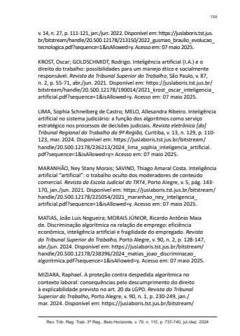 739Rev. Trib. Reg. Trab. 3ª Reg., Belo Horizonte, v. 70, n. 110, p. 737-740, jul./dez. 2024v. 14, n. 27, p. 111-121, jan./jun. 2022. Disponível em: https://juslaboris.tst.jus.br/bitstream/handle/20.500.12178/213150/2022_gusmao_braulio_evolucao_tecnologica.pdf?sequence=1&isAllowed=y. Acesso em: 07 maio 2025.KROST, Oscar; GOLDSCHMIDT, Rodrigo. Inteligência artificial (I.A.) e o direito do trabalho: possibilidades para um manejo ético e socialmente responsável. Revista do Tribunal Superior do Trabalho, São Paulo, v. 87, n. 2, p. 55-71, abr./jun. 2021. Disponível em: https://juslaboris.tst.jus.br/bitstream/handle/20.500.12178/190014/2021_krost_oscar_inteligencia_artificial.pdf?sequence=1&isAllowed=y. Acesso em: 07 maio 2025.LIMA, Sophia Schneiberg de Castro; MELO, Allesandra Ribeiro. Inteligência artificial no sistema judiciário: a função dos algoritmos como serviço estratégico nos processos de decisões judiciais. Revista eletrônica [do] Tribunal Regional do Trabalho da 9ª Região, Curitiba, v. 13, n. 129, p. 110-123, mar. 2024. Disponível em: https://juslaboris.tst.jus.br/bitstream/handle/20.500.12178/236213/2024_lima_sophia_inteligencia_artificial.pdf?sequence=1&isAllowed=y> Acesso em: 07 maio 2025.MARANHÃO, Ney Stany Morais; SAVINO, Thiago Amaral Costa. Inteligência artificial “artificial”: o trabalho oculto dos moderadores de conteúdo comercial. Revista da Escola Judicial do TRT4, Porto Alegre, v. 5, pág. 143-170, jan./jun. 2021. Disponível em: https://juslaboris.tst.jus.br/bitstream/handle/20.500.12178/225054/2021_maranhao_ney_inteligencia_artificial.pdf?sequence=1&isAllowed=y. Acesso em: 07 maio 2025.MATIAS, João Luís Nogueira; MORAIS JÚNIOR, Ricardo Antônio Maia de. Discriminação algorítmica na relação de emprego: eficiência econômica, inteligência artificial e fragilidade do empregado. Revista do Tribunal Superior do Trabalho, Porto Alegre, v. 90, n. 2, p. 128-147, abr./jun. 2024. Disponível em: https://juslaboris.tst.jus.br/bitstream/handle/20.500.12178/238396/2024_matias_joao_discriminacao_algoritmica.pdf?sequence=1&isAllowed=y. Acesso em: 07 maio 2025.MIZIARA, Raphael. A proteção contra despedida algorítmica no contexto laboral: consequências pelo descumprimento do direito à explicabilidade previsto no art. 20 da LGPD. Revista do Tribunal Superior do Trabalho, Porto Alegre, v. 90, n. 1, p. 230-249, jan./mar. 2024. Disponível em: https://juslaboris.tst.jus.br/bitstream/
