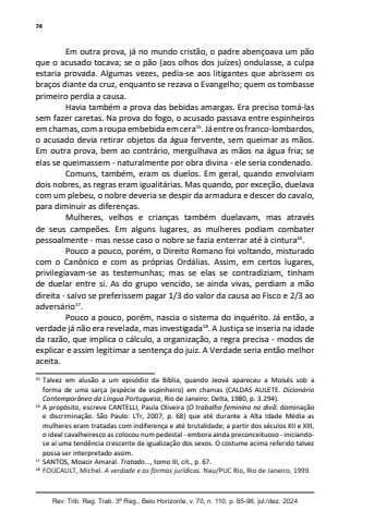 74Rev. Trib. Reg. Trab. 3ª Reg., Belo Horizonte, v. 70, n. 110, p. 65-96, jul./dez. 2024Em outra prova, já no mundo cristão, o padre abençoava um pão que o acusado tocava; se o pão (aos olhos dos juízes) ondulasse, a culpa estaria provada. Algumas vezes, pedia-se aos litigantes que abrissem os braços diante da cruz, enquanto se rezava o Evangelho; quem os tombasse primeiro perdia a causa.Havia também a prova das bebidas amargas. Era preciso tomá-las sem fazer caretas. Na prova do fogo, o acusado passava entre espinheiros em chamas, com a roupa embebida em cera15. Já entre os franco-lombardos, o acusado devia retirar objetos da água fervente, sem queimar as mãos. Em outra prova, bem ao contrário, mergulhava as mãos na água fria; se elas se queimassem - naturalmente por obra divina - ele seria condenado.Comuns, também, eram os duelos. Em geral, quando envolviam dois nobres, as regras eram igualitárias. Mas quando, por exceção, duelava com um plebeu, o nobre deveria se despir da armadura e descer do cavalo, para diminuir as diferenças.Mulheres, velhos e crianças também duelavam, mas através de seus campeões. Em alguns lugares, as mulheres podiam combater pessoalmente - mas nesse caso o nobre se fazia enterrar até à cintura16.Pouco a pouco, porém, o Direito Romano foi voltando, misturado com o Canônico e com as próprias Ordálias. Assim, em certos lugares, privilegiavam-se as testemunhas; mas se elas se contradiziam, tinham de duelar entre si. As do grupo vencido, se ainda vivas, perdiam a mão direita - salvo se preferissem pagar 1/3 do valor da causa ao Fisco e 2/3 ao adversário17.Pouco a pouco, porém, nascia o sistema do inquérito. Já então, a verdade já não era revelada, mas investigada18. A Justiça se inseria na idade da razão, que implica o cálculo, a organização, a regra precisa - modos de explicar e assim legitimar a sentença do juiz. A Verdade seria então melhor aceita.15 Talvez em alusão a um episódio da Bíblia, quando Jeová apareceu a Moisés sob a forma de uma sarça (espécie de espinheiro) em chamas (CALDAS AULETE. Dicionário Contemporâneo da Língua Portuguesa, Rio de Janeiro: Delta, 1980, p. 3.294). 16 A propósito, escreve CANTELLI, Paula Oliveira (O trabalho feminino no divã: dominação e discriminação. São Paulo: LTr, 2007, p. 68) que até durante a Alta Idade Média as mulheres eram tratadas com indiferença e até brutalidade; a partir dos séculos XII e XIII, o ideal cavalheiresco as colocou num pedestal - embora ainda preconceituoso - iniciandose aí uma tendência crescente de igualização dos sexos. O costume acima referido talvez possa ser interpretado assim. 17 SANTOS, Moacir Amaral. Tratado..., tomo III, cit., p. 67. 18 FOUCAULT, Michel. A verdade e as formas jurídicas. Nau/PUC Rio, Rio de Janeiro, 1999.