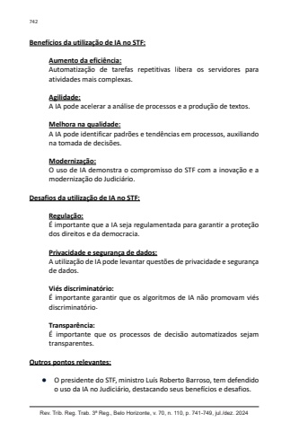 742Rev. Trib. Reg. Trab. 3ª Reg., Belo Horizonte, v. 70, n. 110, p. 741-749, jul./dez. 2024Benefícios da utilização de IA no STF:Aumento da eficiência:Automatização de tarefas repetitivas libera os servidores para atividades mais complexas.Agilidade:A IA pode acelerar a análise de processos e a produção de textos.Melhora na qualidade:A IA pode identificar padrões e tendências em processos, auxiliando na tomada de decisões.Modernização:O uso de IA demonstra o compromisso do STF com a inovação e a modernização do Judiciário.Desafios da utilização de IA no STF:Regulação:É importante que a IA seja regulamentada para garantir a proteção dos direitos e da democracia.Privacidade e segurança de dados:A utilização de IA pode levantar questões de privacidade e segurança de dados.Viés discriminatório:É importante garantir que os algoritmos de IA não promovam viés discriminatório.Transparência:É importante que os processos de decisão automatizados sejam transparentes.Outros pontos relevantes:● O presidente do STF, ministro Luís Roberto Barroso, tem defendido o uso da IA no Judiciário, destacando seus benefícios e desafios.