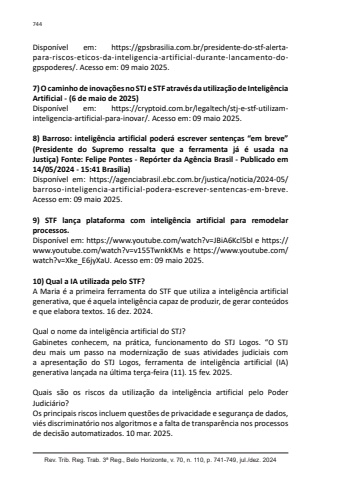 744Rev. Trib. Reg. Trab. 3ª Reg., Belo Horizonte, v. 70, n. 110, p. 741-749, jul./dez. 2024Disponível em: https://gpsbrasilia.com.br/presidente-do-stf-alertapara-riscos-eticos-da-inteligencia-artificial-durante-lancamento-dogpspoderes/. Acesso em: 09 maio 2025.7) O caminho de inovações no STJ e STF através da utilização de Inteligência Artificial - (6 de maio de 2025)Disponível em: https://cryptoid.com.br/legaltech/stj-e-stf-utilizaminteligencia-artificial-para-inovar/. Acesso em: 09 maio 2025.8) Barroso: inteligência artificial poderá escrever sentenças “em breve” (Presidente do Supremo ressalta que a ferramenta já é usada na Justiça) Fonte: Felipe Pontes - Repórter da Agência Brasil - Publicado em 14/05/2024 - 15:41 Brasília)Disponível em: https://agenciabrasil.ebc.com.br/justica/noticia/2024-05/barroso-inteligencia-artificial-podera-escrever-sentencas-em-breve. Acesso em: 09 maio 2025.9) STF lança plataforma com inteligência artificial para remodelar processos.Disponível em: https://www.youtube.com/watch?v=JBiA6Kcl5bI e https://www.youtube.com/watch?v=v155TwnkKMs e https://www.youtube.com/watch?v=Xke_E6jyXaU. Acesso em: 09 maio 2025.10) Qual a IA utilizada pelo STF?A Maria é a primeira ferramenta do STF que utiliza a inteligência artificial generativa, que é aquela inteligência capaz de produzir, de gerar conteúdos e que elabora textos. 16 dez. 2024.Qual o nome da inteligência artificial do STJ?Gabinetes conhecem, na prática, funcionamento do STJ Logos. “O STJ deu mais um passo na modernização de suas atividades judiciais com a apresentação do STJ Logos, ferramenta de inteligência artificial (IA) generativa lançada na última terça-feira (11). 15 fev. 2025.Quais são os riscos da utilização da inteligência artificial pelo Poder Judiciário?Os principais riscos incluem questões de privacidade e segurança de dados, viés discriminatório nos algoritmos e a falta de transparência nos processos de decisão automatizados. 10 mar. 2025.