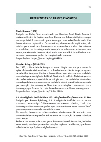 753Rev. Trib. Reg. Trab. 3ª Reg., Belo Horizonte, v. 70, n. 110, p. 753-754, jul./dez. 2024REFERÊNCIAS DE FILMES CLÁSSICOSBlade Runner (1982)Dirigido por Ridley Scott e estrelado por Harrison Ford, Blade Runner é mais um clássico da ficção científica. Aborda um futuro distópico, em que um ex-policial é contratado para investigar uma rebelião de androides humanoides e capturá-los. Os androides, chamados de replicantes, são criados para servir aos humanos e se assemelham a eles. No entanto, os modelos com tecnologia mais avançada se rebelam e se tornam uma ameaça à soberania humana. Aqui, mais uma vez a IA é intimidadora, mas dessa vez como um espelho da complexidade humana.Disponível em: https://youtu.be/eogpIG53Cis.Matrix - Trilogia (1999-2003)Em 1999, o filme Matrix inaugurou uma trilogia marcada por cenas de ação, efeitos visuais inovadores e profundas teorias. Neste longa, um grupo de rebeldes luta para libertar a humanidade, que vive em uma realidade controlada pela Inteligência Artificial. Na virada do milênio, Matrix despertou discussões sobre o potencial da tecnologia em criar realidades simuladas - como hoje falamos em metaverso, realidade virtual e realidade aumentada, por exemplo. No entanto, o filme traz uma relação controversa com a tecnologia, que é capaz de controlar os humanos e até levar a uma guerra.Disponível em: https://youtu.be/2KnZac176Hs.A.I. - Inteligência Artificial Livre 2001 - Ficção científica/Aventura - 2h 26mDirigido por Steven Spielberg, A.I.: Inteligência Artificial traz no nome o assunto deste artigo. O filme retrata um menino robótico, criado com tecnologias altamente avançadas, que busca se tornar uma pessoa “real” para recuperar o amor da sua mãe humana.No enredo, humanos e robôs convivem diariamente. No entanto, essa convivência levanta questões éticas e morais da criação de seres robóticos conscientes.Embora sua autonomia possa gerar inúmeros benefícios sociais, inclusive emocionais, também pode criar relações repletas de dilemas, que fazem refletir sobre a própria condição humana.
