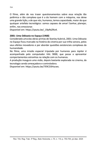 754Rev. Trib. Reg. Trab. 3ª Reg., Belo Horizonte, v. 70, n. 110, p. 753-754, jul./dez. 2024O filme, além de nos trazer questionamentos sobre essa relação tão polêmica e tão complexa que é a do homem com a máquina, nos deixa uma grande lição, a de que nós, humanos, temos capacidade, maior do que qualquer artefato tecnológico: somos capazes de amar! Sonhar, planejar, enfim, nos emocionar.Disponível em: https://youtu.be/_19pRsZRiz4.2001: Uma Odisseia no Espaço (1968)Considerado uma das obras-primas de Stanley Kubrick, 2001: Uma Odisseia no Espaço ficou marcado na história do cinema por sua trilha sonora, pelos seus efeitos inovadores e por abordar questões existenciais complexas da humanidade.No filme, uma missão espacial tripulada por humanos para Júpiter é acompanhada pelo computador HAL 9000, que passa a apresentar comportamentos estranhos na relação com os humanos.A produção inaugura uma visão, depois bastante explorada no cinema, da tecnologia sendo ameaçadora e controladora.Disponível em: https://youtu.be/7E9CD3Hucws.