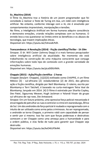 756Rev. Trib. Reg. Trab. 3ª Reg., Belo Horizonte, v. 70, n. 110, p. 755-757, jul./dez. 2024Ex_Machina (2014)O filme Ex_Machina traz a história de um jovem programador que foi convidado a realizar o Teste de Turing em Ava, um robô com inteligência artificial. No entanto, conforme interage com a IA, ele é envolvido por comportamentos imprevisíveis, manipulações e tensões.No filme, a Inteligência Artificial em forma humana adquire consciência e demonstra emoções, criando relações complexas com os humanos. O enredo leva a nos questionar os limites entre os benefícios e os abusos da tecnologia, que trazem implicações éticas.Disponível em: https://youtu.be/54nzsdLPs9I.Transcendence: A Revolução (2014) - Ficção científica/Thriller - 1h 59mSinopse. O dr. Will Caster (Johnny Depp) é o mais famoso pesquisador sobre inteligência artificial da atualidade. No momento ele está trabalhando na construção de uma máquina consciente que conjuga informações sobre todo tipo de conteúdo com a grande variedade de emoções humanas.Disponível em: https://youtu.be/pLoD0lLVIMA.Chappie (2015) - Ação/Ficção científica - 2 horasChappie (bra/prt: Chappie), [1][2][3] estilizado como CHAPPiE, é um filme México [3] - sul-africano [2] -estadunidense [2] de 2015, dos gêneros ação e ficção científica, dirigido por Neill Blomkamp. O roteiro, escrito por Blomkamp e Terri Tatchell, é baseado no curta-metragem Tetra Vaal de Blomkamp, lançado em 2014. [4] O filme é estrelado por Sharlto Copley, Dev Patel, Sigourney Weaver, Hugh Jackman e Yolandi Visser do grupo sul-africano de rap-rave, Die Antwoord.Sinopse: Em um futuro próximo, uma opressiva força policial mecanizada é encarregada de patrulhar as ruas e controlar o crime em Joanesburgo, África do Sul. Um dos androides da força policial é roubado e reprogramado com o intuito de ser utilizado como arma pelos criminosos. Ao ser reprogramado, o androide se torna Chappie, o primeiro robô com capacidade de pensar e sentir por si mesmo. Isso faz com que forças poderosas e destrutivas comecem a ver Chappie como uma ameaça para a humanidade e para a ordem pública, e elas farão de tudo para garantir que Chappie seja destruído.Disponível em: https://youtu.be/kxO4tUF9vN4.