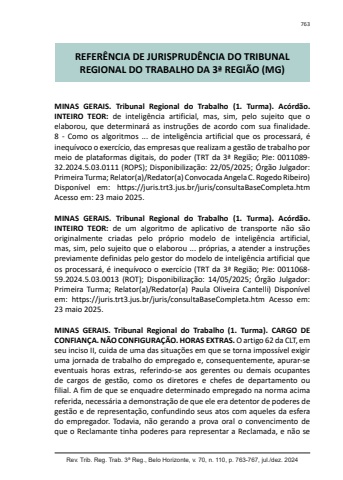 763Rev. Trib. Reg. Trab. 3ª Reg., Belo Horizonte, v. 70, n. 110, p. 763-767, jul./dez. 2024REFERÊNCIA DE JURISPRUDÊNCIA DO TRIBUNAL REGIONAL DO TRABALHO DA 3ª REGIÃO (MG)MINAS GERAIS. Tribunal Regional do Trabalho (1. Turma). Acórdão. INTEIRO TEOR: de inteligência artificial, mas, sim, pelo sujeito que o elaborou, que determinará as instruções de acordo com sua finalidade. 8 - Como os algoritmos ... de inteligência artificial que os processará, é inequívoco o exercício, das empresas que realizam a gestão de trabalho por meio de plataformas digitais, do poder (TRT da 3ª Região; PJe: 0011089-32.2024.5.03.0111 (ROPS); Disponibilização: 22/05/2025; Órgão Julgador: Primeira Turma; Relator(a)/Redator(a) Convocada Angela C. Rogedo Ribeiro) Disponível em: https://juris.trt3.jus.br/juris/consultaBaseCompleta.htm Acesso em: 23 maio 2025.MINAS GERAIS. Tribunal Regional do Trabalho (1. Turma). Acórdão. INTEIRO TEOR: de um algoritmo de aplicativo de transporte não são originalmente criadas pelo próprio modelo de inteligência artificial, mas, sim, pelo sujeito que o elaborou ... próprias, a atender a instruções previamente definidas pelo gestor do modelo de inteligência artificial que os processará, é inequívoco o exercício (TRT da 3ª Região; PJe: 0011068-59.2024.5.03.0013 (ROT); Disponibilização: 14/05/2025; Órgão Julgador: Primeira Turma; Relator(a)/Redator(a) Paula Oliveira Cantelli) Disponível em: https://juris.trt3.jus.br/juris/consultaBaseCompleta.htm Acesso em: 23 maio 2025.MINAS GERAIS. Tribunal Regional do Trabalho (1. Turma). CARGO DE CONFIANÇA. NÃO CONFIGURAÇÃO. HORAS EXTRAS. O artigo 62 da CLT, em seu inciso II, cuida de uma das situações em que se torna impossível exigir uma jornada de trabalho do empregado e, consequentemente, apurar-se eventuais horas extras, referindo-se aos gerentes ou demais ocupantes de cargos de gestão, como os diretores e chefes de departamento ou filial. A fim de que se enquadre determinado empregado na norma acima referida, necessária a demonstração de que ele era detentor de poderes de gestão e de representação, confundindo seus atos com aqueles da esfera do empregador. Todavia, não gerando a prova oral o convencimento de que o Reclamante tinha poderes para representar a Reclamada, e não se