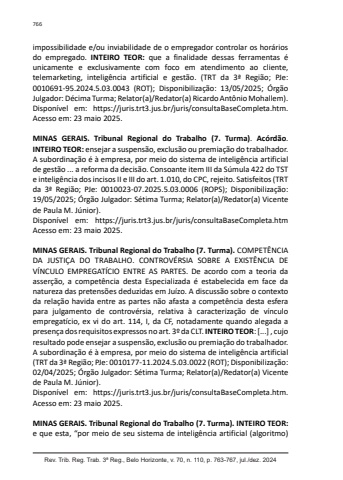 766Rev. Trib. Reg. Trab. 3ª Reg., Belo Horizonte, v. 70, n. 110, p. 763-767, jul./dez. 2024impossibilidade e/ou inviabilidade de o empregador controlar os horários do empregado. INTEIRO TEOR: que a finalidade dessas ferramentas é unicamente e exclusivamente com foco em atendimento ao cliente, telemarketing, inteligência artificial e gestão. (TRT da 3ª Região; PJe: 0010691-95.2024.5.03.0043 (ROT); Disponibilização: 13/05/2025; Órgão Julgador: Décima Turma; Relator(a)/Redator(a) Ricardo Antônio Mohallem).Disponível em: https://juris.trt3.jus.br/juris/consultaBaseCompleta.htm. Acesso em: 23 maio 2025.MINAS GERAIS. Tribunal Regional do Trabalho (7. Turma). Acórdão. INTEIRO TEOR: ensejar a suspensão, exclusão ou premiação do trabalhador. A subordinação é à empresa, por meio do sistema de inteligência artificial de gestão ... a reforma da decisão. Consoante item III da Súmula 422 do TST e inteligência dos incisos II e III do art. 1.010, do CPC, rejeito. Satisfeitos (TRT da 3ª Região; PJe: 0010023-07.2025.5.03.0006 (ROPS); Disponibilização: 19/05/2025; Órgão Julgador: Sétima Turma; Relator(a)/Redator(a) Vicente de Paula M. Júnior).Disponível em: https://juris.trt3.jus.br/juris/consultaBaseCompleta.htm Acesso em: 23 maio 2025.MINAS GERAIS. Tribunal Regional do Trabalho (7. Turma). COMPETÊNCIA DA JUSTIÇA DO TRABALHO. CONTROVÉRSIA SOBRE A EXISTÊNCIA DE VÍNCULO EMPREGATÍCIO ENTRE AS PARTES. De acordo com a teoria da asserção, a competência desta Especializada é estabelecida em face da natureza das pretensões deduzidas em Juízo. A discussão sobre o contexto da relação havida entre as partes não afasta a competência desta esfera para julgamento de controvérsia, relativa à caracterização de vínculo empregatício, ex vi do art. 114, I, da CF, notadamente quando alegada a presença dos requisitos expressos no art. 3º da CLT. INTEIRO TEOR: [...] , cujo resultado pode ensejar a suspensão, exclusão ou premiação do trabalhador. A subordinação é à empresa, por meio do sistema de inteligência artificial (TRT da 3ª Região; PJe: 0010177-11.2024.5.03.0022 (ROT); Disponibilização: 02/04/2025; Órgão Julgador: Sétima Turma; Relator(a)/Redator(a) Vicente de Paula M. Júnior).Disponível em: https://juris.trt3.jus.br/juris/consultaBaseCompleta.htm. Acesso em: 23 maio 2025.MINAS GERAIS. Tribunal Regional do Trabalho (7. Turma). INTEIRO TEOR:e que esta, “por meio de seu sistema de inteligência artificial (algoritmo)