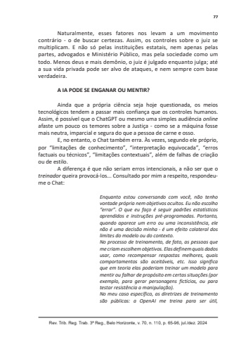 77Rev. Trib. Reg. Trab. 3ª Reg., Belo Horizonte, v. 70, n. 110, p. 65-96, jul./dez. 2024Naturalmente, esses fatores nos levam a um movimento contrário - o de buscar certezas. Assim, os controles sobre o juiz se multiplicam. E não só pelas instituições estatais, nem apenas pelas partes, advogados e Ministério Público, mas pela sociedade como um todo. Menos deus e mais demônio, o juiz é julgado enquanto julga; até a sua vida privada pode ser alvo de ataques, e nem sempre com base verdadeira.A IA PODE SE ENGANAR OU MENTIR?Ainda que a própria ciência seja hoje questionada, os meios tecnológicos tendem a passar mais confiança que os controles humanos. Assim, é possível que o ChatGPT ou mesmo uma simples audiência online afaste um pouco os temores sobre a Justiça - como se a máquina fosse mais neutra, imparcial e segura do que a pessoa de carne e osso.E, no entanto, o Chat também erra. Às vezes, segundo ele próprio, por “limitações de conhecimento”, “interpretação equivocada”, “erros factuais ou técnicos”, “limitações contextuais”, além de falhas de criação ou de estilo.A diferença é que não seriam erros intencionais, a não ser que o treinador queira provocá-los... Consultado por mim a respeito, respondeume o Chat:Enquanto estou conversando com você, não tenho vontade própria nem objetivos ocultos. Eu não escolho “errar”. O que eu faço é seguir padrões estatísticos aprendidos e instruções pré-programadas. Portanto, quando aparece um erro ou uma inconsistência, ele não é uma decisão minha - é um efeito colateral dos limites do modelo ou do contexto.No processo de treinamento, de fato, as pessoas que me criam escolhem objetivos. Elas definem quais dados usar, como recompensar respostas melhores, quais comportamentos são aceitáveis, etc. Isso significa que em teoria elas poderiam treinar um modelo para mentir ou falhar de propósito em certas situações (por exemplo, para gerar personagens fictícios, ou para testar resistência a manipulação).No meu caso específico, as diretrizes de treinamento são públicas: a OpenAI me treina para ser útil,
