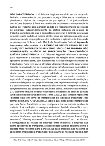 770Rev. Trib. Reg. Trab. 3ª Reg., Belo Horizonte, v. 70, n. 110, p. 769-777, jul./dez. 2024NÃO CARACTERIZADA. 1. O Tribunal Regional concluiu ser da Justiça do Trabalho a competência para processar e julgar lides entre motoristas e plataformas digitais de transporte de passageiros. 2. A jurisprudência desta Corte Superior é firme no sentido de reconhecer a competência da Justiça do Trabalho para apreciar pedido de reconhecimento de relação de emprego, independentemente da efetiva natureza da relação de trabalho, considerando que a competência material é definida pela causa de pedir e pelo pedido. A mesma diretriz deve ser aplicada nas ações que discutem vínculo empregatício entre motorista e aplicativo de transporte de passageiros. 3. Ileso o art. 114, I, da Constituição Federal. Agravo de instrumento não provido. II - RECURSO DE REVISTA REGIDO PELA LEI 13.467/2017. MOTORISTA DE APLICATIVO. VÍNCULO DE EMPREGO. NÃO CONFIGURAÇÃO. AUSÊNCIA DE SUBORDINAÇÃO. TRANSCENDÊNCIA JURÍDICA CARACTERIZADA. 1. O Tribunal Regional reformou a sentença para reconhecer a natureza empregatícia da relação entre motorista e aplicativo de transporte, com fundamento na subordinação estrutural do trabalhador, “uma vez que a atividade desempenhada pelo autor estava inserida na atividade-fim da ré, além de ficar estruturalmente submetida à dinâmica organizacional do empreendimento econômico alheio”. Destacou, ainda, que “o sistema de controle adotado se concretizava mediante instrumentos telemáticos e informatizados de comando, controle e supervisão. Consignou, ainda, que, “por meio do mecanismo de avaliações, que eram delegadas aos próprios clientes, a ré implementava a fiscalização e o controle sobre o modo de execução do serviço de transporte e sobre o comportamento dos condutores, de forma difusa, indireta e terceirizada”. 2. O Supremo Tribunal Federal reconheceu a repercussão geral da questão jurídica objeto do recurso de revista (Tema 1.291), a qual também representa “questão nova em torno da interpretação da legislação trabalhista”, nos termos do art. 896-A, §1º, IV, da CLT, sobre a qual ainda pende interpretação por esta Corte Trabalhista, o que configura a transcendência jurídica da matéria. 3. A revolução tecnológica iniciada no final do século XX, com o surgimento da informática e da internet, vem alterando sensivelmente o mercado de trabalho, eliminando antigas profissões e criando novas formas de labor, fenômeno que tem sido denominado de diversas formas (“gig economy”, “sharing economy”, “on-demand economy” etc.). 4. Quanto à configuração da relação de emprego entre motorista e empresa que opera aplicativos de transporte, a subordinação jurídica desponta como o aspecto mais relevante para a análise. No caso presente, não há como se considerar empregado o trabalhador que assume os riscos do negócio, tem