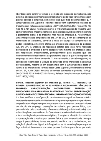 771Rev. Trib. Reg. Trab. 3ª Reg., Belo Horizonte, v. 70, n. 110, p. 769-777, jul./dez. 2024liberdade para definir o tempo e o modo de execução do trabalho, não detém a obrigação permanente de trabalhar e pode ficar vários meses sem prestar serviço à empresa, sem sofrer qualquer tipo de penalidade. 5. A jurisprudência do Supremo Tribunal Federal vem legitimando relações de trabalho sem natureza empregatícia (ADPF 324, RE 958.252 - Tema 725-RG, ADC 48 e ADI 5625). No mesmo norte, o Tribunal Superior do Trabalho vem compreendendo, majoritariamente, que a relação jurídica entre motorista e plataforma digital é de trabalho, mas não de emprego. 6. Ao promover uma interpretação ampliativa do art. 3º da CLT, a fim de contemplar os motoristas de aplicativo, corre-se o risco de usurpar a competência do poder legislativo, em grave ofensa ao princípio da separação de poderes (CF, art. 2º). A urgência da regulação estatal para essa nova realidade de trabalho é evidente e deve assegurar um mínimo de proteção social aos respectivos trabalhadores, principalmente para aqueles que são financeiramente dependentes da plataforma digital e que não dispõem de emprego ou outra fonte de renda. 7. Nesse sentido, a decisão regional, no sentido de reconhecer o vínculo de emprego entre motorista e aplicativo de transporte, mostra-se em dissonância com a jurisprudência desta 5ª Turma e da maioria das Turmas desta Corte Superior, evidenciando ofensa ao art. 5º, II, da CF/88. Recurso de revista conhecido e provido. (RRAg - 0010472-79.2023.5.03.0023 5ª Turma, Relator Douglas Alencar Rodrigues,DEJT 29/05/2025).BRASIL. Tribunal Superior do Trabalho (6. Turma) “[...] RECURSO DE REVISTA. SUMARÍSSIMO. LEI Nº 13.467/2017. RECLAMANTE. VÍNCULO DE EMPREGO. CARACTERIZAÇÃO. MOTOFRETISTA. ENTREGA DE MERCADORIAS VIA APLICATIVO. PLATAFORMA DIGITAL. SUBORDINAÇÃO JURÍDICA POR MEIOS TELEMÁTICOS OU INFORMATIZADOS (ALGORITMOS). 1 - Para verificar a configuração de vínculo empregatício deve-se aferir - independentemente da atividade exercida pelo empregador ou pela forma de gestão adotada pela empresa - a presença dos elementos caracterizadores do vínculo de emprego: prestação de trabalho por pessoa física, com pessoalidade pelo trabalhador, não eventualidade (ou habitualidade), com subordinação e onerosidade. 2 - Quando se trata de trabalho efetuado com a intermediação de plataformas digitais, é simples a aferição dos critérios da prestação de trabalho por pessoa física e com onerosidade. No que tange à pessoalidade, faz-se necessário verificar se o trabalhador, em relação à plataforma digital, é infungível ou se há autorização para que se faça substituir livremente por outra pessoa. 3 - Para que o labor por meio