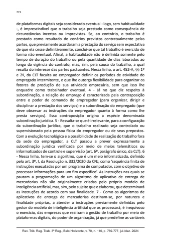 772Rev. Trib. Reg. Trab. 3ª Reg., Belo Horizonte, v. 70, n. 110, p. 769-777, jul./dez. 2024de plataformas digitais seja considerado eventual - logo, sem habitualidade -, é imprescindível que o trabalho seja prestado como consequência de circunstâncias incertas ou imprevistas. Se, ao contrário, o trabalho é prestado como resultado de cenários previstos contratualmente pelas partes, que previamente acordaram a prestação do serviço sem expectativa de que ela cesse definitivamente, conclui-se que tal trabalho é exercido de forma não eventual. Afinal, a habitualidade não é definida somente pelo tempo de duração do trabalho ou pela quantidade de dias laborados ao longo da vigência do contrato, mas, sim, pela causa do trabalho, a qual resulta do interesse das partes pactuantes. Nessa linha, o art. 452-A, §§ 1º e 2º, da CLT faculta ao empregador definir os períodos de atividade do empregado intermitente, o que lhe outorga flexibilidade para organizar os fatores de produção de sua atividade empresária, sem que isso lhe enquadre como trabalhador eventual. 4 - Já no que diz respeito à subordinação, a relação de emprego é caracterizada pela contraposição entre o poder de comando do empregador (para organizar, dirigir e disciplinar a prestação dos serviços) e a subordinação do empregado (que deve observar as instruções do empregador quanto à forma como lhe presta serviços). Essa contraposição origina a espécie denominada subordinação jurídica. 5 - Ressalta-se que é irrelevante, para a configuração da subordinação jurídica, que o trabalho realizado seja controlado ou supervisionado pela pessoa física do empregador ou de seus prepostos. Com a evolução tecnológica e a possibilidade de realização do trabalho fora da sede do empregador, a CLT passou a prever expressamente a subordinação jurídica verificada por meio de meios telemáticos ou informatizados de controle e supervisão (art. 6º, parágrafo único, da CLT). 6 - Nessa linha, tem-se o algoritmo, que é um meio informatizado, definido pelo art. 3º, I, da Resolução n. 332/2020 do CNJ, como ‘sequência finita de instruções executadas por um programa de computador, com o objetivo de processar informações para um fim específico’. As instruções nas quais se pautam a programação de um algoritmo de aplicativo de entrega de mercadorias não são originalmente criadas pelo próprio modelo de inteligência artificial, mas, sim, pelo sujeito que o elaborou, que determinará as instruções de acordo com sua finalidade. 7 - Como os algoritmos de aplicativos de entrega de mercadorias destinam-se, por natureza e finalidade próprias, a atender a instruções previamente definidas pelo gestor do modelo de inteligência artificial que os processará, é inequívoco o exercício, das empresas que realizam a gestão de trabalho por meio de plataformas digitais, do poder de organização, já que predefine as variáveis