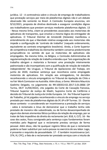 774Rev. Trib. Reg. Trab. 3ª Reg., Belo Horizonte, v. 70, n. 110, p. 769-777, jul./dez. 2024jurídica. 12 - A controvérsia sobre o vínculo de emprego de trabalhadores que prestação serviços por meio de plataformas digitais não é um debate observado tão somente no Brasil. A Comissão Europeia anunciou, em 9/12/2021, proposta de diretiva destinada a assegurar condições dignas aos trabalhadores que prestam serviços mediante plataformas digitais. 13 - Nessa mesma linha, citam-se precedentes associados aos motoristas de aplicativos de transportes, que envolve a mesma lógica do entregador de aplicativos. O Tribunal Distrital de Amsterdã (Holanda) manifestou o entendimento de que a liberdade relativa assegurada aos motoristas não impede a configuração de ‘contrato de trabalho’ (naquele ordenamento, equivalente ao contrato empregatício brasileiro). Ainda, a Corte Superior de competência trabalhista da Alemanha também conserva predominante jurisprudência no sentido de que os motoristas de aplicativos são empregados. Na mesma linha, na Bélgica, a Comissão Administrativa de regulamentação da relação de trabalho entendeu que ‘tais organizações de trabalho obrigam o motorista a fornecer uma prestação inteiramente padronizada e são incompatíveis com a qualificação de relação de trabalho independente’. No Uruguai, o Tribunal de Apelaciones del Trabajo, em junho de 2020, manteve sentença que reconhecia como empregado motorista de aplicativos. Em relação aos entregadores, há decisões reconhecendo o vínculo empregatício no Tribunal de Apelação do Chile e na Fair Work Comission na Austrália. Além disso, o Exmo. Ministro Mauricio Godinho Delgado, no julgamento do RR-100353-02.2017.5.01.0066 (3ª Turma, DEJT 11/04/2022), cita julgados da Corte de Cassação francesa, Tribunal Superior de Justiça de Madri, Suprema Corte da Califórnia e decisão do Tribunal de Justiça da União Europeia. 14 - No Tribunal Superior do Trabalho, já há julgados reconhecendo o vínculo de emprego no serviço prestado por meio de plataformas digitais da 3ª, 6ª e 8ª Turmas. 15 - Diante desse contexto - e considerando ser incontroversa a prestação de serviços - cabia à reclamada o ônus de demonstrar que o trabalho tenha sido prestado de maneira não subordinada, ou de forma desacompanhada de algum dos demais elementos fático-jurídicos da relação de emprego, por se tratar de fato impeditivo do direito do reclamante (art. 818, II, CLT). 16 - No caso dos autos, ficou consignado pela sentença cujos fundamentos foram mantidos pelo Regional que o reclamante prestou serviços de forma pessoal. Além disso, não há qualquer registro fático de que o reclamante poderia se fazer substituir por outra pessoa no exercício de seu labor. Logo, é presente o requisito da pessoalidade. 17 - É também incontroverso (art. 374, III, CPC), o fato de o reclamante ter prestado serviços com o intuito de