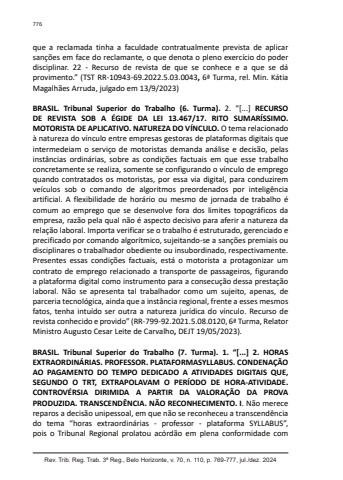 776Rev. Trib. Reg. Trab. 3ª Reg., Belo Horizonte, v. 70, n. 110, p. 769-777, jul./dez. 2024que a reclamada tinha a faculdade contratualmente prevista de aplicar sanções em face do reclamante, o que denota o pleno exercício do poder disciplinar. 22 - Recurso de revista de que se conhece e a que se dá provimento.” (TST RR-10943-69.2022.5.03.0043, 6ª Turma, rel. Min. Kátia Magalhães Arruda, julgado em 13/9/2023)BRASIL. Tribunal Superior do Trabalho (6. Turma). 2. “[...] RECURSO DE REVISTA SOB A ÉGIDE DA LEI 13.467/17. RITO SUMARÍSSIMO. MOTORISTA DE APLICATIVO. NATUREZA DO VÍNCULO. O tema relacionado à natureza do vínculo entre empresas gestoras de plataformas digitais que intermedeiam o serviço de motoristas demanda análise e decisão, pelas instâncias ordinárias, sobre as condições factuais em que esse trabalho concretamente se realiza, somente se configurando o vínculo de emprego quando contratados os motoristas, por essa via digital, para conduzirem veículos sob o comando de algoritmos preordenados por inteligência artificial. A flexibilidade de horário ou mesmo de jornada de trabalho é comum ao emprego que se desenvolve fora dos limites topográficos da empresa, razão pela qual não é aspecto decisivo para aferir a natureza da relação laboral. Importa verificar se o trabalho é estruturado, gerenciado e precificado por comando algorítmico, sujeitando-se a sanções premiais ou disciplinares o trabalhador obediente ou insubordinado, respectivamente. Presentes essas condições factuais, está o motorista a protagonizar um contrato de emprego relacionado a transporte de passageiros, figurando a plataforma digital como instrumento para a consecução dessa prestação laboral. Não se apresenta tal trabalhador como um sujeito, apenas, de parceria tecnológica, ainda que a instância regional, frente a esses mesmos fatos, tenha intuído ser outra a natureza jurídica do vínculo. Recurso de revista conhecido e provido” (RR-799-92.2021.5.08.0120, 6ª Turma, Relator Ministro Augusto Cesar Leite de Carvalho, DEJT 19/05/2023).BRASIL. Tribunal Superior do Trabalho (7. Turma). 1. “[...] 2. HORAS EXTRAORDINÁRIAS. PROFESSOR. PLATAFORMASYLLABUS. CONDENAÇÃO AO PAGAMENTO DO TEMPO DEDICADO A ATIVIDADES DIGITAIS QUE, SEGUNDO O TRT, EXTRAPOLAVAM O PERÍODO DE HORA-ATIVIDADE. CONTROVÉRSIA DIRIMIDA A PARTIR DA VALORAÇÃO DA PROVA PRODUZIDA. TRANSCENDÊNCIA. NÃO RECONHECIMENTO. I. Não merece reparos a decisão unipessoal, em que não se reconheceu a transcendência do tema “horas extraordinárias - professor - plataforma SYLLABUS”, pois o Tribunal Regional prolatou acórdão em plena conformidade com