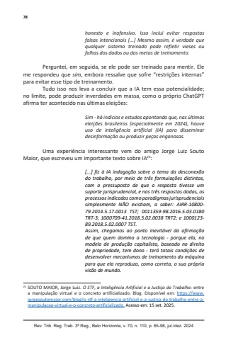 78Rev. Trib. Reg. Trab. 3ª Reg., Belo Horizonte, v. 70, n. 110, p. 65-96, jul./dez. 2024honesto e inofensivo. Isso inclui evitar respostas falsas intencionais [...] Mesmo assim, é verdade que qualquer sistema treinado pode refletir vieses ou falhas dos dados ou das metas de treinamento.Perguntei, em seguida, se ele pode ser treinado para mentir. Ele me respondeu que sim, embora ressalve que sofre “restrições internas” para evitar esse tipo de treinamento.Tudo isso nos leva a concluir que a IA tem essa potencialidade; no limite, pode produzir inverdades em massa, como o próprio ChatGPT afirma ter acontecido nas últimas eleições:Sim - há indícios e estudos apontando que, nas últimas eleições brasileiras (especialmente em 2024), houve uso de inteligência artificial (IA) para disseminar desinformação ou produzir peças enganosas.Uma experiência interessante vem do amigo Jorge Luiz Souto Maior, que escreveu um importante texto sobre IA25:[...] fiz à IA indagação sobre o tema da desconexão do trabalho, por meio de três formulações distintas, com o pressuposto de que a resposta tivesse um suporte jurisprudencial, e nas três respostas dadas, os processos indicados como paradigmas jurisprudenciais simplesmente NÃO existiam, a saber: AIRR-10800-79.2014.5.17.0013 TST; 0011359-98.2016.5.03.0180 TRT-3; 1000709-41.2018.5.02.0038 TRT2; e 1000123-89.2018.5.02.0007 TST.Assim, chegamos ao ponto inevitável da afirmação de que quem domina a tecnologia - porque ela, no modelo de produção capitalista, baseado no direito de propriedade, tem dono - terá totais condições de desenvolver mecanismos de treinamento da máquina para que ela reproduza, como correta, a sua própria visão de mundo.25 SOUTO MAIOR, Jorge Luiz. O STF, a Inteligência Artificial e a Justiça do Trabalho: entre a manipulação virtual e o concreto artificializado. Blog. Disponível em: https://www.jorgesoutomaior.com/blog/o-stf-a-inteligencia-artificial-e-a-justica-do-trabalho-entre-amanipulacao-virtual-e-o-concreto-artificializado. Acesso em: 15 set. 2025.