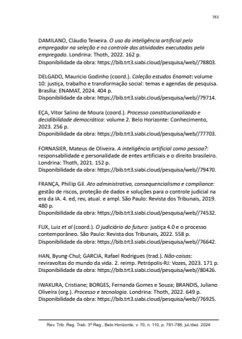 783Rev. Trib. Reg. Trab. 3ª Reg., Belo Horizonte, v. 70, n. 110, p. 781-786, jul./dez. 2024DAMILANO, Cláudio Teixeira. O uso da inteligência artificial pelo empregador na seleção e no controle das atividades executadas pelo empregado. Londrina: Thoth, 2022. 162 p.Disponibilidade da obra: https://bib.trt3.siabi.cloud/pesquisa/web//78803.DE LGADO, Mauricio Godinho (coord.). Coleção estudos Enamat: volume 10: justiça, trabalho e transformação social: temas e agendas de pesquisa. Brasília: ENAMAT, 2024. 404 p.Disponibilidade da obra: https://bib.trt3.siabi.cloud/pesquisa/web//79714.EÇA, Vitor Salino de Moura (coord.). Processo constitucionalizado e decidibilidade democrática: volume 2. Belo Horizonte: Conhecimento, 2023. 256 p.Disponibilidade da obra: https://bib.trt3.siabi.cloud/pesquisa/web//77703.FORNASIER, Mateus de Oliveira. A inteligência artificial como pessoa?:responsabilidade e personalidade de entes artificiais e o direito brasileiro. Londrina: Thoth, 2021. 152 p.Disponibilidade da obra: https://bib.trt3.siabi.cloud/pesquisa/web//79470.FR ANÇA, Phillip Gil. Ato administrativo, consequencialismo e compliance:gestão de riscos, proteção de dados e soluções para o controle judicial na era da IA. 4. ed, rev, atual. e ampl. São Paulo: Revista dos Tribunais, 2019. 480 p.Disponibilidade da obra: https://bib.trt3.siabi.cloud/pesquisa/web//74532.FUX, Luiz et al (coord.). O judiciário do futuro: justiça 4.0 e o processo contemporâneo. São Paulo: Revista dos Tribunais, 2022. 558 p.Disponibilidade da obra: https://bib.trt3.siabi.cloud/pesquisa/web//76642.HAN, Byung-Chul; GARCIA, Rafael Rodrigues (trad.). Não-coisas: reviravoltas do mundo da vida. 2. reimp. Petrópolis-RJ: Vozes, 2023. 171 p.Disponibilidade da obra: https://bib.trt3.siabi.cloud/pesquisa/web//80426.IWAKURA, Cristiane; BORGES, Fernanda Gomes e Souza; BRANDIS, Juliano Oliveira (org.). Processo e tecnologia. Londrina: Thoth, 2022. 649 p.Disponibilidade da obra: https://bib.trt3.siabi.cloud/pesquisa/web//76925.
