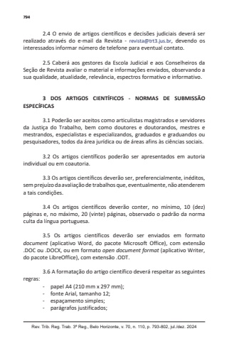 794Rev. Trib. Reg. Trab. 3ª Reg., Belo Horizonte, v. 70, n. 110, p. 793-802, jul./dez. 20242.4 O envio de artigos científicos e decisões judiciais deverá ser realizado através do e-mail da Revista - revista@trt3.jus.br, devendo os interessados informar número de telefone para eventual contato.2.5 Caberá aos gestores da Escola Judicial e aos Conselheiros da Seção de Revista avaliar o material e informações enviados, observando a sua qualidade, atualidade, relevância, espectros formativo e informativo.3 DOS ARTIGOS CIENTÍFICOS - NORMAS DE SUBMISSÃO ESPECÍFICAS3.1 Poderão ser aceitos como articulistas magistrados e servidores da Justiça do Trabalho, bem como doutores e doutorandos, mestres e mestrandos, especialistas e especializandos, graduados e graduandos ou pesquisadores, todos da área jurídica ou de áreas afins às ciências sociais.3.2 Os artigos científicos poderão ser apresentados em autoria individual ou em coautoria.3.3 Os artigos científicos deverão ser, preferencialmente, inéditos, sem prejuízo da avaliação de trabalhos que, eventualmente, não atenderem a tais condições.3.4 Os artigos científicos deverão conter, no mínimo, 10 (dez) páginas e, no máximo, 20 (vinte) páginas, observado o padrão da norma culta da língua portuguesa.3.5 Os artigos científicos deverão ser enviados em formato document (aplicativo Word, do pacote Microsoft Office), com extensão .DOC ou .DOCX, ou em formato open document format (aplicativo Writer, do pacote LibreOffice), com extensão .ODT.3.6 A formatação do artigo científico deverá respeitar as seguintes regras:- papel A4 (210 mm x 297 mm);- fonte Arial, tamanho 12;- espaçamento simples;- parágrafos justificados;