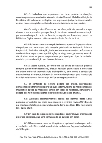 799Rev. Trib. Reg. Trab. 3ª Reg., Belo Horizonte, v. 70, n. 110, p. 793-802, jul./dez. 20246.3 Os trabalhos que expuserem, em tese, pessoas a situações constrangedoras ou vexatórias, violando o inciso X do art. 5º da Constituição da República, além daquelas protegidas por segredo de justiça, terão abreviados os seus nomes completos, utilizando-se exclusivamente de suas iniciais.6.4 Os artigos científicos e as decisões judiciais enviados e que vierem a ser aprovados para publicação implicam automática autorização para a sua divulgação tanto na Revista, em quaisquer formatos, quanto na Biblioteca Digital e/ou no sítio eletrônico desta Escola Judicial.6.5 Não haverá nenhuma espécie de contraprestação pecuniária ou de qualquer outra natureza pelo material publicado na Revista do Tribunal Regional do Trabalho 3ª Região, independentemente do tipo de formato e ou de mídia em que ocorra a publicação, sendo gratuita, portanto, a cessão de direitos autorais pelos responsáveis por qualquer tipo de trabalho enviado para cada edição em desenvolvimento.6.6 A Escola Judicial, por meio de sua Seção de Revista, poderá, sempre que se fizer necessário, efetuar revisões gramaticais e alterações de ordem editorial (normalização bibliográfica), bem como a adequação dos trabalhos a serem publicados às normas disciplinadas pela Associação Brasileira de Normas Técnicas (ABNT) e ao respectivo Edital.6.7 O conteúdo da Revista poderá ser citado, reproduzido, armazenado ou transmitido por qualquer sistema, forma ou meio eletrônico, magnético, óptico ou mecânico, sendo, em todas as hipóteses, obrigatória a citação dos nomes dos autores e da fonte de publicação original.6.8 Eventuais esclarecimentos acerca das normas deste Edital poderão ser obtidos por meio do endereço eletrônico revista@trt3.jus.br ou, mediante telefone, de segunda a sexta-feira, das 8h às 18h, no número (31) 3235-9529.6.9 Em caso de excepcional necessidade, poderá haver prorrogação do prazo editalício, que será comunicada ao público em geral.6.10 Os casos omissos e as situações excepcionais serão apreciados e resolvidos pelo Diretor da Escola Judicial do Tribunal Regional do Trabalho da 3ª Região.