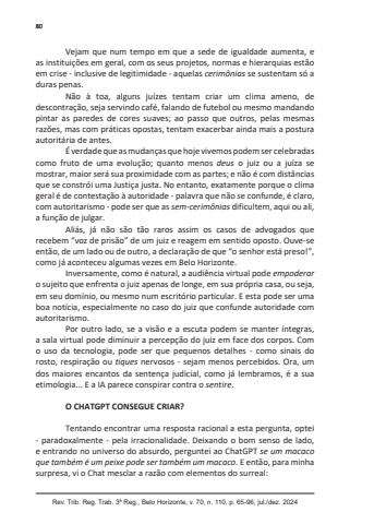 80Rev. Trib. Reg. Trab. 3ª Reg., Belo Horizonte, v. 70, n. 110, p. 65-96, jul./dez. 2024Vejam que num tempo em que a sede de igualdade aumenta, e as instituições em geral, com os seus projetos, normas e hierarquias estão em crise - inclusive de legitimidade - aquelas cerimônias se sustentam só a duras penas.Não à toa, alguns juízes tentam criar um clima ameno, de descontração, seja servindo café, falando de futebol ou mesmo mandando pintar as paredes de cores suaves; ao passo que outros, pelas mesmas razões, mas com práticas opostas, tentam exacerbar ainda mais a postura autoritária de antes.É verdade que as mudanças que hoje vivemos podem ser celebradas como fruto de uma evolução; quanto menos deus o juiz ou a juíza se mostrar, maior será sua proximidade com as partes; e não é com distâncias que se constrói uma Justiça justa. No entanto, exatamente porque o clima geral é de contestação à autoridade - palavra que não se confunde, é claro, com autoritarismo - pode ser que as sem-cerimônias dificultem, aqui ou ali, a função de julgar.Aliás, já não são tão raros assim os casos de advogados que recebem “voz de prisão” de um juiz e reagem em sentido oposto. Ouve-se então, de um lado ou de outro, a declaração de que “o senhor está preso!”, como já aconteceu algumas vezes em Belo Horizonte.Inversamente, como é natural, a audiência virtual pode empoderaro sujeito que enfrenta o juiz apenas de longe, em sua própria casa, ou seja, em seu domínio, ou mesmo num escritório particular. E esta pode ser uma boa notícia, especialmente no caso do juiz que confunde autoridade com autoritarismo.Por outro lado, se a visão e a escuta podem se manter íntegras, a sala virtual pode diminuir a percepção do juiz em face dos corpos. Com o uso da tecnologia, pode ser que pequenos detalhes - como sinais do rosto, respiração ou tiques nervosos - sejam menos percebidos. Ora, um dos maiores encantos da sentença judicial, como já lembramos, é a sua etimologia... E a IA parece conspirar contra o sentire.O CHATGPT CONSEGUE CRIAR?Tentando encontrar uma resposta racional a esta pergunta, optei - paradoxalmente - pela irracionalidade. Deixando o bom senso de lado, e entrando no universo do absurdo, perguntei ao ChatGPT se um macaco que também é um peixe pode ser também um macaco. E então, para minha surpresa, vi o Chat mesclar a razão com elementos do surreal: