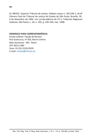 802Rev. Trib. Reg. Trab. 3ª Reg., Belo Horizonte, v. 70, n. 110, p. 793-802, jul./dez. 2024Ex: BRASIL. Superior Tribunal de Justiça. Habeas corpus n. 181.636-1, da 6ª Câmara Cível do Tribunal de Justiça do Estado de São Paulo, Brasília, DF, 6 de dezembro de 1994. Lex: jurisprudência do STJ e Tribunais Regionais Federais, São Paulo, v. 10, n. 103, p. 236-240, mar. 1998.ENDEREÇO PARA CORRESPONDÊNCIA:Escola Judicial / Seção da RevistaRua Guaicurus, nº 203, Bairro CentroBelo Horizonte - MG - BrasilCEP 30111-060Fone: 55 (31) 3235-9529E-mail: revista@trt3.jus.br
