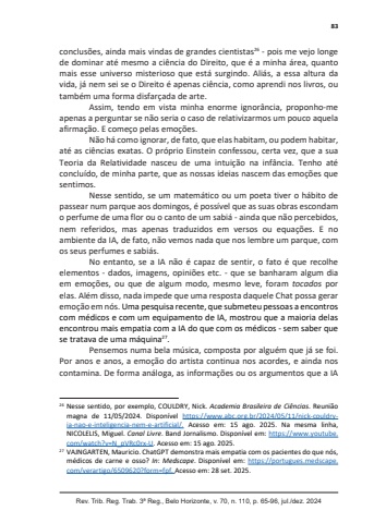 83Rev. Trib. Reg. Trab. 3ª Reg., Belo Horizonte, v. 70, n. 110, p. 65-96, jul./dez. 2024conclusões, ainda mais vindas de grandes cientistas26 - pois me vejo longe de dominar até mesmo a ciência do Direito, que é a minha área, quanto mais esse universo misterioso que está surgindo. Aliás, a essa altura da vida, já nem sei se o Direito é apenas ciência, como aprendi nos livros, ou também uma forma disfarçada de arte.Assim, tendo em vista minha enorme ignorância, proponho-me apenas a perguntar se não seria o caso de relativizarmos um pouco aquela afirmação. E começo pelas emoções.Não há como ignorar, de fato, que elas habitam, ou podem habitar, até as ciências exatas. O próprio Einstein confessou, certa vez, que a sua Teoria da Relatividade nasceu de uma intuição na infância. Tenho até concluído, de minha parte, que as nossas ideias nascem das emoções que sentimos.Nesse sentido, se um matemático ou um poeta tiver o hábito de passear num parque aos domingos, é possível que as suas obras escondam o perfume de uma flor ou o canto de um sabiá - ainda que não percebidos, nem referidos, mas apenas traduzidos em versos ou equações. E no ambiente da IA, de fato, não vemos nada que nos lembre um parque, com os seus perfumes e sabiás.No entanto, se a IA não é capaz de sentir, o fato é que recolhe elementos - dados, imagens, opiniões etc. - que se banharam algum dia em emoções, ou que de algum modo, mesmo leve, foram tocados por elas. Além disso, nada impede que uma resposta daquele Chat possa gerar emoção em nós. Uma pesquisa recente, que submeteu pessoas a encontros com médicos e com um equipamento de IA, mostrou que a maioria delas encontrou mais empatia com a IA do que com os médicos - sem saber que se tratava de uma máquina27.Pensemos numa bela música, composta por alguém que já se foi. Por anos e anos, a emoção do artista continua nos acordes, e ainda nos contamina. De forma análoga, as informações ou os argumentos que a IA 26 Nesse sentido, por exemplo, COULDRY, Nick. Academia Brasileira de Ciências. Reunião magna de 11/05/2024. Disponível https://www.abc.org.br/2024/05/11/nick-couldryia-nao-e-inteligencia-nem-e-artificial/. Acesso em: 15 ago. 2025. Na mesma linha, NICOLELIS, Miguel. Canal Livre. Band Jornalismo. Disponível em: https://www.youtube.com/watch?v=N_pVRc0rx-U. Acesso em: 15 ago. 2025. 27 VAJNGARTEN, Mauricio. ChatGPT demonstra mais empatia com os pacientes do que nós, médicos de carne e osso? In: Medscape. Disponível em: https://portugues.medscape.com/verartigo/6509620?form=fpf. Acesso em: 28 set. 2025.