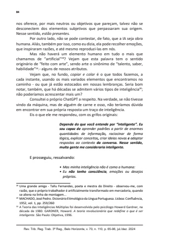 84Rev. Trib. Reg. Trab. 3ª Reg., Belo Horizonte, v. 70, n. 110, p. 65-96, jul./dez. 2024nos oferece, por mais neutros ou objetivos que pareçam, talvez não se desconectem dos elementos subjetivos que perpassaram sua origem. Nesse sentido, estão presentes.Por outro lado, não se pode contestar, de fato, que a IA seja obra humana. Aliás, também por isso, como eu dizia, ela pode recolher emoções, que inspiraram razões, e até mesmo reproduzi-las em nós.Mas não haverá um elemento humano em tudo o mais que chamamos de “artificial”28? Vejam que esta palavra tem o sentido originário de “feito com arte”, sendo arte o sinônimo de “talento, saber, habilidade”29.- alguns de nossos atributos.Vejam que, no fundo, copiar e colar é o que todos fazemos, a cada instante, usando os mais variados elementos que encontramos no caminho - ou que já estão estocados em nossas lembranças. Seria bom notar, também, que há décadas se admitem vários tipos de inteligência30; não poderíamos acrescentar mais um?Consultei o próprio ChatGPT a respeito. Na verdade, se não tivesse vindo da máquina, mas de alguém de carne e osso, não teríamos dúvida em encontrar em sua própria resposta um traço de inteligência.Eis o que ele me respondeu, com os grifos originais:Depende do que você entende por “inteligente”. Eu sou capaz de aprender padrões a partir de enormes quantidades de informação, raciocinar de forma lógica, explicar conceitos, criar ideias novas e adaptar respostas ao contexto da conversa. Nesse sentido, muita gente me consideraria inteligente.E prosseguiu, ressalvando:• Mas minha inteligência não é como a humana:• Eu não tenho consciência, emoções ou desejos próprios.28 Uma grande amiga - Tallu Fernandes, poeta e mestra do Direito - observou-me, com razão, que o próprio trabalhador é artificialmente transformado em mercadoria, quando se aliena na linha de montagem... 29 MACHADO, José Pedro. Dicionário Etimológico da Língua Portuguesa. Lisboa: Confluência, 1952, vol. 1, pp. 259/260 30 A Teoria das Inteligências Múltiplas foi desenvolvida pelo psicólogo Howard Gardner, na década de 1980. GARDNER, Howard. A teoria revolucionária que redefine o que é ser inteligente. São Paulo: Objetiva, 1996.