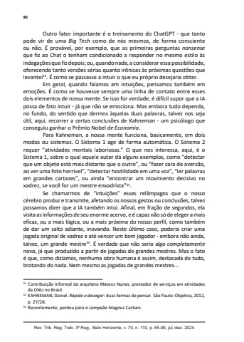 86Rev. Trib. Reg. Trab. 3ª Reg., Belo Horizonte, v. 70, n. 110, p. 65-96, jul./dez. 2024Outro fator importante é o treinamento do ChatGPT - que tanto pode vir de uma Big Tech como de nós mesmos, de forma consciente ou não. É provável, por exemplo, que as primeiras perguntas nonsenseque fiz ao Chat o tenham condicionado a responder no mesmo estilo às indagações que fiz depois; ou, quando nada, a considerar essa possibilidade, oferecendo tanto versões sérias quanto irônicas às próximas questões que levantei31. É como se passasse a intuir o que eu próprio desejaria obter.Em geral, quando falamos em intuições, pensamos também em emoções. É como se houvesse sempre uma linha de contato entre esses dois elementos de nossa mente. Se isso for verdade, é difícil supor que a IA possa de fato intuir - já que não se emociona. Mas embora tudo dependa, no fundo, do sentido que dermos àquelas duas palavras, talvez nos seja útil, aqui, recorrer a certas conclusões de Kahneman - um psicólogo que conseguiu ganhar o Prêmio Nobel de Economia.Para Kahneman, a nossa mente funciona, basicamente, em dois modos ou sistemas. O Sistema 1 age de forma automática. O Sistema 2 requer “atividades mentais laboriosas.” O que nos interessa, aqui, é o Sistema 1, sobre o qual aquele autor dá alguns exemplos, como “detectar que um objeto está mais distante que o outro”, ou “fazer cara de aversão, ao ver uma foto horrível”, “detectar hostilidade em uma voz”, “ler palavras em grandes cartazes”, ou ainda “encontrar um movimento decisivo no xadrez, se você for um mestre enxadrista”32.Se chamarmos de “intuições” esses relâmpagos que o nosso cérebro produz e transmite, afetando os nossos gestos ou conclusões, talvez possamos dizer que a IA também intui. Afinal, em fração de segundos, ela visita as informações de seu enorme acervo, e é capaz não só de eleger a mais eficaz, ou a mais lógica, ou a mais próxima do nosso perfil, como também de dar um salto adiante, inovando. Neste último caso, poderia criar uma jogada original de xadrez e até vencer um bom jogador - embora não ainda, talvez, um grande mestre33. É verdade que não seria algo completamentenovo, já que produzido a partir de jogadas de grandes mestres. Mas o fato é que, como dizíamos, nenhuma obra humana é assim, destacada de tudo, brotando do nada. Nem mesmo as jogadas de grandes mestres...31 Contribuição informal do arquiteto Mateus Nunes, prestador de serviços em atividades da ONU no Brasil. 32 KAHNEMAN, Daniel. Rápido e devagar: duas formas de pensar. São Paulo: Objetiva, 2012, p. 27/28. 33 Recentemente, perdeu para o campeão Magnus Carlsen.