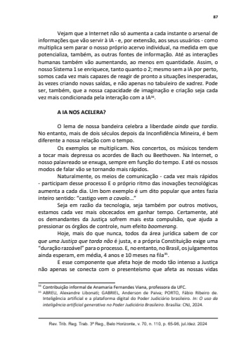 87Rev. Trib. Reg. Trab. 3ª Reg., Belo Horizonte, v. 70, n. 110, p. 65-96, jul./dez. 2024Vejam que a Internet não só aumenta a cada instante o arsenal de informações que vão servir à IA - e, por extensão, aos seus usuários - como multiplica sem parar o nosso próprio acervo individual, na medida em que potencializa, também, as outras fontes de informação. Até as interações humanas também vão aumentando, ao menos em quantidade. Assim, o nosso Sistema 1 se enriquece, tanto quanto o 2; mesmo sem a IA por perto, somos cada vez mais capazes de reagir de pronto a situações inesperadas, às vezes criando novas saídas, e não apenas no tabuleiro de xadrez. Pode ser, também, que a nossa capacidade de imaginação e criação seja cada vez mais condicionada pela interação com a IA34.A IA NOS ACELERA?O lema de nossa bandeira celebra a liberdade ainda que tardia. No entanto, mais de dois séculos depois da Inconfidência Mineira, é bem diferente a nossa relação com o tempo.Os exemplos se multiplicam. Nos concertos, os músicos tendem a tocar mais depressa os acordes de Bach ou Beethoven. Na Internet, o nosso palavreado se enxuga, sempre em função do tempo. E até os nossos modos de falar vão se tornando mais rápidos.Naturalmente, os meios de comunicação - cada vez mais rápidos - participam desse processo E o próprio ritmo das inovações tecnológicas aumenta a cada dia. Um bom exemplo é um dito popular que antes fazia inteiro sentido: “castigo vem a cavalo...”Seja em razão da tecnologia, seja também por outros motivos, estamos cada vez mais obcecados em ganhar tempo. Certamente, até os demandantes da Justiça sofrem mais esta compulsão, que ajuda a pressionar os órgãos de controle, num efeito boomerang.Hoje, mais do que nunca, todos da área jurídica sabem de cor que uma Justiça que tarda não é justa, e a própria Constituição exige uma “duração razoável” para o processo. E, no entanto, no Brasil, os julgamentos ainda esperam, em média, 4 anos e 10 meses na fila35.E esse componente que afeta hoje de modo tão intenso a Justiça não apenas se conecta com o presenteísmo que afeta as nossas vidas 34 Contribuição informal de Anamaria Fernandes Viana, professora da UFC.35 ABREU, Alexandre Libonati; GABRIEL, Anderson de Paiva; PORTO, Fábio Ribeiro de. Inteligência artificial e a plataforma digital do Poder Judiciário brasileiro. In: O uso da inteligência artificial generativa no Poder Judiciário Brasileiro. Brasília: CNJ, 2024.