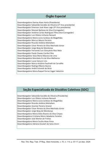 Rev. Trib. Reg. Trab. 3ª Reg., Belo Horizonte, v. 70, n. 110, p. 07-17, jul./dez. 2024Órgão EspecialSeção Especializada de Dissídios Coletivos (SDC)Desembargadora Denise Alves Horta (Presidente)Desembargador Sebastião Geraldo de Oliveira (1º Vice-presidente)Desembargador Emerson José Alves Lage (2º Vice-presidente)Desembargador Manoel Barbosa da Silva (Corregedor)Desembargador Antônio Carlos Rodrigues Filho (Vice-Corregedor)Desembargador Luiz Otávio Linhares RenaultDesembargadora Maria Lúcia Cardoso de MagalhãesDesembargador Marcus Moura FerreiraDesembargador Ricardo Antônio MohallemDesembargador César Pereira da Silva Machado JúniorDesembargador Jorge Berg de MendonçaDesembargador Fernando Luiz Gonçalves Rios NetoDesembargador Paulo Chaves Corrêa FilhoDesembargadora Taisa Maria Macena de LimaDesembargadora Maristela Íris da Silva MalheirosDesembargador Lucas Vanucci LinsDesembargador Marco Antônio Paulinelli de CarvalhoDesembargador Rodrigo Ribeiro BuenoDesembargador André Schmidt de BritoDesembargadora Maria Raquel Ferraz Zagari ValentimDesembargador Sebastião Geraldo de Oliveira (Presidente)Desembargador Luiz Otávio Linhares RenaultDesembargadora Maria Lúcia Cardoso de MagalhãesDesembargador Ricardo Antônio MohallemDesembargador Anemar Pereira AmaralDesembargador César Pereira da Silva Machado JúniorDesembargador Jorge Berg de MendonçaDesembargadora Maria Stela Álvares da Silva CmposDesembargadora Cristiana Maria Valadares FenelonDesembargador José Marlon de FreitasDesembargadora Maria Cecília Alves PintoDesembargadora Adriana Goulart de Sena Orsini