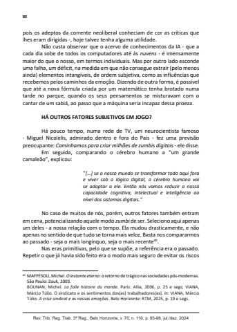 90Rev. Trib. Reg. Trab. 3ª Reg., Belo Horizonte, v. 70, n. 110, p. 65-96, jul./dez. 2024pois os adeptos da corrente neoliberal conheciam de cor as críticas que lhes eram dirigidas -, hoje talvez tenha alguma utilidade.Não custa observar que o acervo de conhecimentos da IA - que a cada dia sobe de todos os computadores até às nuvens - é imensamente maior do que o nosso, em termos individuais. Mas por outro lado esconde uma falha, um déficit, na medida em que não consegue extrair (pelo menos ainda) elementos intangíveis, de ordem subjetiva, como as influências que recebemos pelos caminhos da emoção. Dizendo de outra forma, é possível que até a nova fórmula criada por um matemático tenha brotado numa tarde no parque, quando os seus pensamentos se misturavam com o cantar de um sabiá, ao passo que a máquina seria incapaz dessa proeza.HÁ OUTROS FATORES SUBJETIVOS EM JOGO?Há pouco tempo, numa rede de TV, um neurocientista famoso - Miguel Nicolelis, admirado dentro e fora do País - fez uma previsão preocupante: Caminhamos para criar milhões de zumbis digitais - ele disse.Em seguida, comparando o cérebro humano a “um grande camaleão”, explicou:“[...] se o nosso mundo se transformar todo aqui fora e viver sob a lógica digital, o cérebro humano vai se adaptar a ele. Então nós vamos reduzir a nossa capacidade cognitiva, intelectual e inteligência ao nível dos sistemas digitais.”No caso de muitos de nós, porém, outros fatores também entram em cena, potencializando aquele modo zumbi de ser. Seleciono aqui apenas um deles - a nossa relação com o tempo. Ela mudou drasticamente, e não apenas no sentido de que tudo se torna mais veloz. Basta nos compararmos ao passado - seja o mais longínquo, seja o mais recente40.Nas eras primitivas, pelo que se supõe, a referência era o passado. Repetir o que já havia sido feito era o modo mais seguro de evitar os riscos 40 MAFFESOLI, Michel. O instante eterno: o retorno do trágico nas sociedades pós-modernas. São Paulo: Zouk, 2003. BOUNAN, Michel. La folle histoire du monde. Paris: Allia, 2006, p. 25 e segs; VIANA, Márcio Túlio. O sindicato e os sentimentos dos(as) trabalhadores(as). In: VIANA, Márcio Túlio. A crise sindical e as nossas emoções. Belo Horizonte: RTM, 2025, p. 19 e segs.