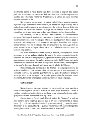 93Rev. Trib. Reg. Trab. 3ª Reg., Belo Horizonte, v. 70, n. 110, p. 65-96, jul./dez. 2024mostrando como a nova tecnologia tem reduzido a espiral das ações judiciais, antes sempre crescente. Foi também este um dos argumentos usados pela chamada “reforma trabalhista”; e várias de suas normas seguiram essa direção.No entanto, pelo menos na esfera trabalhista, é preciso separar o joio do trigo. O excesso de demandas, se existe (ou se já existia), não é fruto de um problema moral ou psicológico; não se trata de uma distorção nos modos de ver ou de buscar a Justiça. Muito menos se trata de uma estratégia geral para extorquir verbas indevidas dos bolsos dos patrões.Na verdade, se há ou houve “demandismo”, é simplesmente porque o Direito do Trabalho - ao contrário do Direito Civil - não se cumpre espontaneamente, pelo menos por inteiro. Se qualquer um de nós paga o preço do café, o ingresso do cinema ou a passagem do ônibus sem sequer pensar em não fazê-lo, muitos de nós, em grau maior ou menor, podem se sentir tentados em sonegar a hora extra ou o adicional noturno, caso se tornem empresários.No plano concreto da vida, como já lembrei, o empresário tende a cumprir a norma pelas metades. Tal como faz com a própria força de trabalho, ele comanda a regra jurídica, aplicando-a como quer, quando quer,quanto quer... e se quiser. E a razão é simples: a partir do FGTS, que extinguiu a estabilidade decenal e barateou a despedida dos instáveis, o empregador se tornou “o detentor do contrato”, para repetir a lição de Vilhena.Desse modo, são as violações de direitos - e não propriamente as ações trabalhistas - que se acumulam. Quase sempre, é apenas quando o contrato termina, ou quando quer terminá-lo, que o trabalhador procura a Justiça. Aliás, é de se supor que a maior parte não o faça sequer nesse momento, temendo retaliações que dificultem um novo emprego.CONCLUINDONaturalmente, estamos apenas no começo dessa nova aventura chamada Inteligência Artificial. No futuro, tudo pode acontecer. Talvez a variável mais importante esteja no fundo da cena: são as relações de poder que potencializam as escolhas das Big Techs.Como observa Yuval Noah Harari, autor de “Sapiens” e outros best-sellers, seria ingênuo pensar que a IA será eternamente a nossa serva, “[...] pois tanto poderá prevenir grandes males [...] como formular desafios”. E ele pergunta: “[...] quando milhares de IA superinteligentes interagirem entre si, que tipos de coisas podem inventar?”