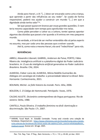 94Rev. Trib. Reg. Trab. 3ª Reg., Belo Horizonte, v. 70, n. 110, p. 65-96, jul./dez. 2024Ainda para Harari, a IA “[...] deve ser encarada como uma criança, que aprende a partir das influências ao seu redor”. Se usada de forma responsável, poderá nos ajudar a construir um mundo “[...] em que a dignidade ainda tenha valor”46.Sei que passei quase em branco por essas grandes questões. E nem teria mesmo capacidade nem tempo para aprofundar-me nelas.Como pôde perceber o Leitor ou a Leitora, tentei apenas apontar algumas das dúvidas que passei a ter quando a IA entrou em meu pequeno mundo.Na verdade, a IA terá de ser melhor entendida não só pelos expertsno assunto, mas por cada uma das pessoas que a estiver usando.Até lá, como nota o mesmo Harari, ela será “indecifrável” para nós.REFERÊNCIASABREU, Alexandre Libonati; GABRIEL, Anderson de Paiva; PORTO, Fábio Ribeiro de. Inteligência artificial e a plataforma digital do Poder Judiciário brasileiro. In: O uso da inteligência artificial generativa no Poder Judiciário Brasileiro. Brasília: CNJ, 2024.ALMEIDA, Cleber Lúcio de; ALMEIDA, Wânia Rabêllo Guimarães de. Diálogos em sociologia do trabalho: a precariedade laboral no Brasil. Belo Horizonte: Conhecimento, 2021.BOUNAN, Michel. La folle histoire du monde. Paris: Allia, 2006.BOUZON, E. O Código de Hammurabi. Petrópolis: Vozes, 1976.CALDAS AULETE. Dicionário contemporâneo da língua portuguesa. Rio de Janeiro: Delta, 1980.CANTELLI, Paula Oliveira. O trabalho feminino no divã: dominação e discriminação. São Paulo: LTr, 2007.46 HARARI, Yuval Noah. In: Estadão Conteúdo. Trump está criando uma coleção de fortalezas. Disponível em: https://www.infomoney.com.br/mundo/trump-esta-criandouma-colecao-de-fortalezas-diz-harari-autor-de-sapiens/?utm_source=whatsapp&utm_medium=social. Acesso em: 18 ago. 2025.