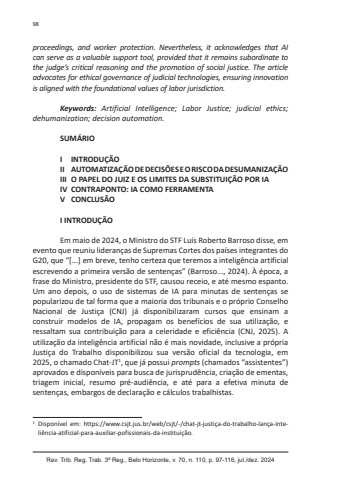 Rev. Trib. Reg. Trab. 3ª Reg., Belo Horizonte, v. 70, n. 110, p. 97-116, jul./dez. 202498proceedings, and worker protection. Nevertheless, it acknowledges that AI can serve as a valuable support tool, provided that it remains subordinate to the judge’s critical reasoning and the promotion of social justice. The article advocates for ethical governance of judicial technologies, ensuring innovation is aligned with the foundational values of labor jurisdiction.Keywords: Artificial Intelligence; Labor Justice; judicial ethics; dehumanization; decision automation.SUMÁRIOI INTRODUÇÃOII AUTOMATIZAÇÃO DE DECISÕES E O RISCO DA DESUMANIZAÇÃOIII O PAPEL DO JUIZ E OS LIMITES DA SUBSTITUIÇÃO POR IAIV CONTRAPONTO: IA COMO FERRAMENTAV CONCLUSÃOI INTRODUÇÃOEm maio de 2024, o Ministro do STF Luís Roberto Barroso disse, em evento que reuniu lideranças de Supremas Cortes dos países integrantes do G20, que “[...] em breve, tenho certeza que teremos a inteligência artificial escrevendo a primeira versão de sentenças” (Barroso..., 2024). À época, a frase do Ministro, presidente do STF, causou receio, e até mesmo espanto. Um ano depois, o uso de sistemas de IA para minutas de sentenças se popularizou de tal forma que a maioria dos tribunais e o próprio Conselho Nacional de Justiça (CNJ) já disponibilizaram cursos que ensinam a construir modelos de IA, propagam os benefícios de sua utilização, e ressaltam sua contribuição para a celeridade e eficiência (CNJ, 2025). A utilização da inteligência artificial não é mais novidade, inclusive a própria Justiça do Trabalho disponibilizou sua versão oficial da tecnologia, em 2025, o chamado Chat-JT1, que já possui prompts (chamados “assistentes”) aprovados e disponíveis para busca de jurisprudência, criação de ementas, triagem inicial, resumo pré-audiência, e até para a efetiva minuta de sentenças, embargos de declaração e cálculos trabalhistas.1 Disponível em: https://www.csjt.jus.br/web/csjt/-/chat-jt-justiça-do-trabalho-lança-inteliência-atificial-para-auxiliar-pofissionais-da-instituição.