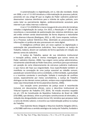 Rev. Trib. Reg. Trab. 3ª Reg., Belo Horizonte, v. 70, n. 110, p. 97-116, jul./dez. 202499A automatização e a digitalização, em si, não são novidade. Ainda em 2006, a Lei n.º 11.419 introduziu a informatização do processo judicial, prevendo em seu artigo 8º que os órgãos do Poder Judiciário poderiam desenvolver sistemas eletrônicos para o trâmite de ações judiciais, com autos total ou parcialmente digitais, preferencialmente acessíveis pela internet e por redes internas e externas.A Lei n.º 11.419/06 foi o marco inaugural de uma série de iniciativas voltadas à digitalização da Justiça. Em 2013, a Resolução n.º 185 do CNJ reconheceu a necessidade de padronização dos sistemas eletrônicos, que até então vinham sendo desenvolvidos de forma dispersa e redundante pelos diversos tribunais (Rodrigues, 2021, p. 40). Como resposta, instituiuse o Processo Judicial Eletrônico (PJe), destinado ao processamento de informações e à prática de atos processuais em meio digital.A inteligência artificial abre um novo capítulo na digitalização e automação dos procedimentos Judiciários. Seus impactos na Justiça do Trabalho, todavia, devem ser avaliados de forma apartada em relação aos demais ramos do Judiciário.A Justiça do Trabalho, apesar de sua relevância institucional e inovação prática, ainda é menos investigada que outros ramos do Poder Judiciário (Gomes, 2006). Sua origem como justiça administrativa, inicialmente subordinada ao Poder Executivo, contribuiu para que estivesse em posição de certo distanciamento da estrutura judiciária tradicional, o que marca até hoje sua singularidade. Essa especificidade também se manifesta na concepção de uma justiça acessível ao cidadão comum, pautada por características como a oralidade, a informalidade, a gratuidade e o incentivo constante à conciliação. Voltada à resolução de conflitos sociais, especialmente por meios conciliatórios, a Justiça do Trabalho distingue-se dos demais ramos judiciais, embora essa originalidade muitas vezes seja interpretada de forma pejorativa (Gomes, 2006).Sua vocação como promotora da justiça social é reconhecida inclusive em documentos oficiais, como o descritivo institucional do Tribunal Superior do Trabalho (TST, 2024). Tal missão encontra respaldo no art. 170 da Constituição da República Federativa do Brasil de 1988 (CR/1988), que destaca, entre os princípios constitucionais ali elencados, a redução das desigualdades sociais (inciso VII), temática que perpassa todo o ramo do Direito Laboral, e encontra sua materialização prática na Justiça do Trabalho.Para Gabriela Neves Delgado e Mauricio Godinho Delgado (2011), a CR/1988 reafirmou o sentido axiológico da Justiça do Trabalho, fundado e