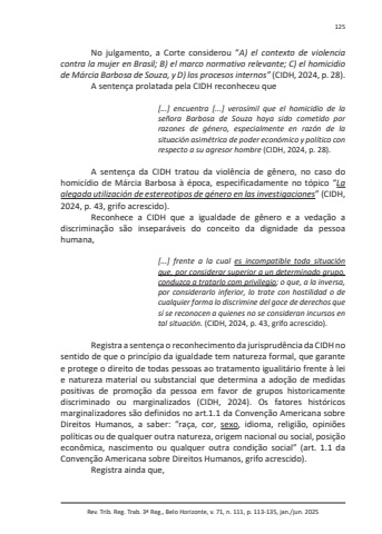 Rev. Trib. Reg. Trab. 3ª Reg., Belo Horizonte, v. 71, n. 111, p. 113-135, jan./jun. 2025125 No julgamento, a Corte considerou “A) el contexto de violencia contra la mujer en Brasil; B) el marco normativo relevante; C) el homicidio de Márcia Barbosa de Souza, y D) los procesos internos” (CIDH, 2024, p. 28).A sentença prolatada pela CIDH reconheceu que[...] encuentra [...] verosímil que el homicidio de la señora Barbosa de Souza haya sido cometido por razones de género, especialmente en razón de la situación asimétrica de poder económico y político con respecto a su agresor hombre (CIDH, 2024, p. 28).A sentença da CIDH tratou da violência de gênero, no caso do homicídio de Márcia Barbosa à época, especificadamente no tópico “La alegada utilización de estereotipos de género en las investigaciones” (CIDH, 2024, p. 43, grifo acrescido).Reconhece a CIDH que a igualdade de gênero e a vedação a discriminação são inseparáveis do conceito da dignidade da pessoa humana,[...] frente a la cual es incompatible toda situación que, por considerar superior a un determinado grupo, conduzca a tratarlo com privilegio; o que, a la inversa, por considerarlo inferior, lo trate con hostilidad o de cualquier forma lo discrimine del goce de derechos que sí se reconocen a quienes no se consideran incursos en tal situación. (CIDH, 2024, p. 43, grifo acrescido).Registra a sentença o reconhecimento da jurisprudência da CIDH no sentido de que o princípio da igualdade tem natureza formal, que garante e protege o direito de todas pessoas ao tratamento igualitário frente à lei e natureza material ou substancial que determina a adoção de medidas positivas de promoção da pessoa em favor de grupos historicamente discriminado ou marginalizados (CIDH, 2024). Os fatores históricos marginalizadores são definidos no art.1.1 da Convenção Americana sobre Direitos Humanos, a saber: “raça, cor, sexo, idioma, religião, opiniões políticas ou de qualquer outra natureza, origem nacional ou social, posição econômica, nascimento ou qualquer outra condição social” (art. 1.1 da Convenção Americana sobre Direitos Humanos, grifo acrescido).Registra ainda que,