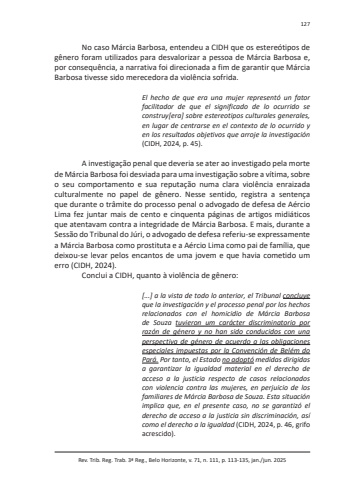 Rev. Trib. Reg. Trab. 3ª Reg., Belo Horizonte, v. 71, n. 111, p. 113-135, jan./jun. 2025127No caso Márcia Barbosa, entendeu a CIDH que os estereótipos de gênero foram utilizados para desvalorizar a pessoa de Márcia Barbosa e, por consequência, a narrativa foi direcionada a fim de garantir que Márcia Barbosa tivesse sido merecedora da violência sofrida.El hecho de que era una mujer representó un fator facilitador de que el significado de lo ocurrido se construy[era] sobre estereotipos culturales generales, en lugar de centrarse en el contexto de lo ocurrido y en los resultados objetivos que arroje la investigación(CIDH, 2024, p. 45).A investigação penal que deveria se ater ao investigado pela morte de Márcia Barbosa foi desviada para uma investigação sobre a vítima, sobre o seu comportamento e sua reputação numa clara violência enraizada culturalmente no papel de gênero. Nesse sentido, registra a sentença que durante o trâmite do processo penal o advogado de defesa de Aércio Lima fez juntar mais de cento e cinquenta páginas de artigos midiáticos que atentavam contra a integridade de Márcia Barbosa. E mais, durante a Sessão do Tribunal do Júri, o advogado de defesa referiu-se expressamente a Márcia Barbosa como prostituta e a Aércio Lima como pai de família, que deixou-se levar pelos encantos de uma jovem e que havia cometido um erro (CIDH, 2024).Conclui a CIDH, quanto à violência de gênero:[...] a la vista de todo lo anterior, el Tribunal concluye que la investigación y el processo penal por los hechos relacionados con el homicidio de Márcia Barbosa de Souza tuvieron um carácter discriminatorio por razón de género y no han sido conducidos con una perspectiva de género de acuerdo a las obligaciones especiales impuestas por la Convención de Belém do Pará. Por tanto, el Estado no adoptó medidas dirigidas a garantizar la igualdad material en el derecho de acceso a la justicia respecto de casos relacionados con violencia contra las mujeres, en perjuicio de los familiares de Márcia Barbosa de Souza. Esta situación implica que, en el presente caso, no se garantizó el derecho de acceso a la justicia sin discriminación, así como el derecho a la igualdad (CIDH, 2024, p. 46, grifo acrescido).