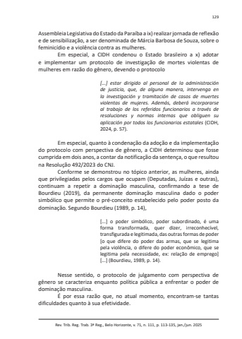 Rev. Trib. Reg. Trab. 3ª Reg., Belo Horizonte, v. 71, n. 111, p. 113-135, jan./jun. 2025129Assembleia Legislativa do Estado da Paraíba a ix) realizar jornada de reflexão e de sensibilização, a ser denominada de Márcia Barbosa de Souza, sobre o feminicídio e a violência contra as mulheres. Em especial, a CIDH condenou o Estado brasileiro a x) adotar e implementar um protocolo de investigação de mortes violentas de mulheres em razão do gênero, devendo o protocolo[...] estar dirigido al personal de la administración de justicia, que, de alguna manera, intervenga en la investigación y tramitación de casos de muertes violentas de mujeres. Además, deberá incorporarse al trabajo de los referidos funcionarios a través de resoluciones y normas internas que obliguen su aplicación por todos los funcionarios estatales (CIDH, 2024, p. 57).Em especial, quanto à condenação da adoção e da implementação do protocolo com perspectiva de gênero, a CIDH determinou que fosse cumprida em dois anos, a contar da notificação da sentença, o que resultou na Resolução 492/2023 do CNJ.Conforme se demonstrou no tópico anterior, as mulheres, ainda que privilegiadas pelos cargos que ocupam (Deputadas, Juízas e outras), continuam a repetir a dominação masculina, confirmando a tese de Bourdieu (2019), da permanente dominação masculina dado o poder simbólico que permite o pré-conceito estabelecido pelo poder posto da dominação. Segundo Bourdieu (1989, p. 14),[...] o poder simbólico, poder subordinado, é uma forma transformada, quer dizer, irreconhecível, transfigurada e legitimada, das outras formas de poder [o que difere do poder das armas, que se legitima pela violência, o difere do poder econômico, que se legitima pela necessidade, ex: relação de emprego] [...] (Bourdieu, 1989, p. 14).Nesse sentido, o protocolo de julgamento com perspectiva de gênero se caracteriza enquanto política pública a enfrentar o poder de dominação masculina.É por essa razão que, no atual momento, encontram-se tantas dificuldades quanto à sua efetividade.