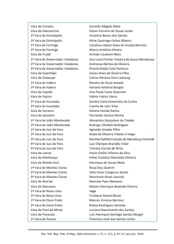 Rev. Trib. Reg. Trab. 3ª Reg., Belo Horizonte, v. 71, n. 111, p. 07-17, jan./jun. 2025Vara de Curvelo Geraldo Magela MeloVara de Diamantina Edson Ferreira de Souza Júnior1ª Vara de Divinópolis Anselmo Bosco dos Santos2ª Vara de Divinópolis Aline Queiroga Fortes Ribeiro1ª Vara de Formiga Carolina Lobato Goes de Araújo Barroso2ª Vara de Formiga Marco Antônio SilveiraVara de Frutal Arlindo Cavalaro Neto1ª Vara de Governador Valadares Ana Luiza Fischer Teixeira de Souza Mendonça2ª Vara de Governador Valadares Andressa Batista de Oliveira3ª Vara de Governador Valadares Priscila Rajão Cota PachecoVara de Guanhães Josias Alves da Silveira FilhoVara de Guaxupé Carlos Adriano Dani Lebourg1ª Vara de Itabira Renato de Paula Amado2ª Vara de Itabira Adriano Antônio BorgesVara de Itajubá Ana Paula Costa GuerzoniVara de Itaúna Valmir Inácio Vieira1ª Vara de Ituiutaba Sandra Carla Simamoto da Cunha2ª Vara de Ituiutaba Camilo de Lelis SilvaVara de Iturama Helena Honda RochaVara de Januária Fernando Saraiva Rocha1ª Vara de João Monlevade Alexandre Gonçalves de Toledo2ª Vara de João Monlevade Rodrigo Cândido Rodrigues1ª Vara de Juiz de Fora Agnaldo Amado Filho2ª Vara de Juiz de Fora Keyla de Oliveira Toledo e Veiga3ª Vara de Juiz de Fora Martha Halfeld Furtado de Mendonça Schmidt4ª Vara de Juiz de Fora Luiz Olympio Brandão Vidal5ª Vara de Juiz de Fora Tarcísio Corrêa de BritoVara de Lavras Paulo Emílio Vilhena da SilvaVara de Manhuaçu Hitler Eustásio Machado OliveiraVara de Monte Azul Henrique de Souza Mota1ª Vara de Montes Claros Rosa Dias Godrim2ª Vara de Montes Claros Júlio César Cangussu Souto3ª Vara de Montes Claros Neurisvan Alves LacerdaVara de Muriaé Marcelo Paes MenezesVara de Nanuque Nelson Henrique Rezende Pereira1ª Vara de Nova Lima Vaga2ª Vara de Nova Lima Cristiano Daniel Muzzi1ª Vara de Ouro Preto Marcos Vinícius Barroso2ª Vara de Ouro Preto Raíssa Rodrigues GomideVara de Pará de Minas Luciana Nascimento dos SantosVara de Paracatu Luís Henrique Santiago Santos Rangel1ª Vara de Passos Francisco José dos Santos Júnior