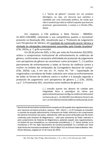 Rev. Trib. Reg. Trab. 3ª Reg., Belo Horizonte, v. 71, n. 111, p. 113-135, jan./jun. 2025131[...] “teoria de gênero” consiste em um produto ideológico, ou seja, um discurso que substitui a realidade por uma motivação política, de modo que não é razoável que dela se valham aqueles que buscam promover, genuinamente, a Justiça e o Direito (PDL, 2025).Em resposta, o CNJ publicou a Nota Técnica - 0004651-31.2025.2.00.0000, reiterando a sua competência quanto a normativa3 presente na Resolução 492, ressaltando que o “Protocolo de Julgamento com Perspectiva de Gênero, [é] resultado de construção plural, técnica e alinhada às obrigações internacionais assumidas pelo Estado brasileiro” (CNJ, 2025a, p. 7, grifo acrescido).Em 28 de julho de 2025, o CNJ, por meio do Provimento 201/2025, reitera o compromisso institucional de enfrentamento às violências de gênero, confirmando a necessária efetividade do protocolo de julgamento com perspectiva de gênero ao reconhecer como princípios “[...] à política permanente de enfrentamento a todas as formas de violência contra a mulher no âmbito das atribuições da Corregedoria Nacional de Justiça” (CNJ, 2025b, s.p), e em seu art. 2º, inciso VII, “VII - Capacitação de magistrados e servidores do Poder Judiciário com vistas ao enfrentamento de todas as formas de violência contra a mulher e à atuação segundo o protocolo de julgamento com perspectiva de gênero [...] (CNJ, 2025b, s.p.)”. O Provimento 201, reconhece como violência de gênero a[...] omissão quanto aos deveres de cuidado pela integridade física e psicológica da vítima que potencialmente possam configurar violência institucional na forma da Lei n. 14.245/2021 [Lei Mariana Ferrer] e da Lei n. 14.321/2022 [crime de violência institucional], assim 3 Nos termos da normativa constitucional compete ao CNJ expedir atos regulamentares que, tem natureza normativa primária, vejamos: “ART. 103-B: [...] § 4º Compete ao Conselho o controle da atuação administrativa e financeira do Poder Judiciário e do cumprimento dos deveres funcionais dos juízes, cabendo-lhe, além de outras atribuições que lhe forem conferidas pelo Estatuto da Magistratura: - zelar pela autonomia do Poder Judiciário e pelo cumprimento do Estatuto da Magistratura, podendo expedir atos regulamentares, no âmbito de sua competência, ou recomendar providências; [...]”. Nesse sentido, já se manifestou o STF em Ação Declaratória de Constitucionalidade 12 e também por meio Ação Direta de Inconstitucionalidade 4.355/4.586/4.312 do Distrito Federal (Relator: Min. Nunes Marques, julgada em 12 de março de 2025).