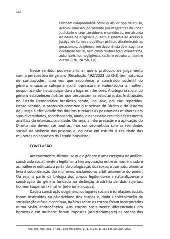 Rev. Trib. Reg. Trab. 3ª Reg., Belo Horizonte, v. 71, n. 111, p. 113-135, jan./jun. 2025132também compreendida como qualquer tipo de abuso, ação ou omissão, perpetrado por integrantes do Poder Judiciário e seus servidores e servidoras, em afronta ao dever de diligência quanto à garantia ao acesso à justiça, de forma a qualificar práticas discriminatórias geracionais, de gênero, em decorrência de misoginia e orientação sexual, bem como revitimização, maus-tratos, autoritarismo, negligência, racismo estrutural, dentre outros (CNJ, 2025b, s.p).Nesse sentido, pode-se afirmar que o protocolo de julgamento com a perspectiva de gênero (Resolução 492/2023 do CNJ) tem natureza de contrapoder, uma vez que reconhece o construído societal do gênero enquanto categoria social opressora e violentadora à mulher, despolitizando-a e subjulgando-a a lugares inferiores. A categoria social do gênero estabeleceu habitus que perpassam as estruturas das Instituições no Estado Democrático brasileiro sendo, inclusive, por elas repetidas. Nesse sentido, o protocolo promove o repensar do Direito e do sistema de justiça à efetividade dos direitos tutelares às pessoas das mulheres em suas diversidades, reconhecendo, ainda, o necessário recurso à ferramenta analítica da interseccionalidade. Ou seja, a interpretação e a aplicação do Direito não devem ser neutras, mas comprometidas com as realidades sociais de vivência das pessoas e, no caso em estudo, à realidade das mulheres no contexto do Estado brasileiro.CONCLUSÃOAnteriormente, afirmou-se que o gênero é uma categoria de análise, construída socialmente a legitimar a hierarquização entre os homens sobre as mulheres edificada a partir da biologização dos sexos, o que naturalmente leva à subordinação das mulheres, excluindo-as arbitrariamente do poder. Ou seja, a partir da biologia dos corpos legitimou-se e naturalizou-se a construção do gênero fundada na distinção arbitrária de dois sujeitos: homem (superior) x mulher (inferior e incapaz).Dada a construção do gênero, os lugares sociais e as relações sociais foram instituídos na objetividade dos corpos e, dada a coletivização da socialização difusa e contínua, habitus sobre os corpos foram incorporados numa visão androcêntrica. Aos corpos socialmente diferenciados em homens e em mulheres foram impostas (arbitrariamente) as ordens das
