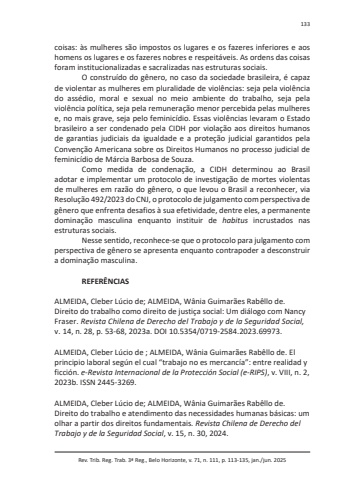 Rev. Trib. Reg. Trab. 3ª Reg., Belo Horizonte, v. 71, n. 111, p. 113-135, jan./jun. 2025133coisas: às mulheres são impostos os lugares e os fazeres inferiores e aos homens os lugares e os fazeres nobres e respeitáveis. As ordens das coisas foram institucionalizadas e sacralizadas nas estruturas sociais.O construído do gênero, no caso da sociedade brasileira, é capaz de violentar as mulheres em pluralidade de violências: seja pela violência do assédio, moral e sexual no meio ambiente do trabalho, seja pela violência política, seja pela remuneração menor percebida pelas mulheres e, no mais grave, seja pelo feminicídio. Essas violências levaram o Estado brasileiro a ser condenado pela CIDH por violação aos direitos humanos de garantias judiciais da igualdade e a proteção judicial garantidos pela Convenção Americana sobre os Direitos Humanos no processo judicial de feminicídio de Márcia Barbosa de Souza.Como medida de condenação, a CIDH determinou ao Brasil adotar e implementar um protocolo de investigação de mortes violentas de mulheres em razão do gênero, o que levou o Brasil a reconhecer, via Resolução 492/2023 do CNJ, o protocolo de julgamento com perspectiva de gênero que enfrenta desafios à sua efetividade, dentre eles, a permanente dominação masculina enquanto instituir de habitus incrustados nas estruturas sociais.Nesse sentido, reconhece-se que o protocolo para julgamento com perspectiva de gênero se apresenta enquanto contrapoder a desconstruir a dominação masculina.REFERÊNCIASALMEIDA, Cleber Lúcio de; ALMEIDA, Wânia Guimarães Rabêllo de. Direito do trabalho como direito de justiça social: Um diálogo com Nancy Fraser. Revista Chilena de Derecho del Trabajo y de la Seguridad Social,v. 14, n. 28, p. 53-68, 2023a. DOI 10.5354/0719-2584.2023.69973.ALMEIDA, Cleber Lúcio de ; ALMEIDA, Wânia Guimarães Rabêllo de. El principio laboral según el cual “trabajo no es mercancía”: entre realidad y ficción. e-Revista Internacional de la Protección Social (e-RIPS), v. VIII, n. 2, 2023b. ISSN 2445-3269.ALMEIDA, Cleber Lúcio de; ALMEIDA, Wânia Guimarães Rabêllo de. Direito do trabalho e atendimento das necessidades humanas básicas: um olhar a partir dos direitos fundamentais. Revista Chilena de Derecho del Trabajo y de la Seguridad Social, v. 15, n. 30, 2024.