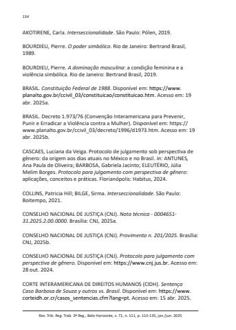 Rev. Trib. Reg. Trab. 3ª Reg., Belo Horizonte, v. 71, n. 111, p. 113-135, jan./jun. 2025134 AKOTIRENE, Carla. Interseccionalidade. São Paulo: Pólen, 2019.BOURDIEU, Pierre. O poder simbólico. Rio de Janeiro: Bertrand Brasil, 1989.BOURDIEU, Pierre. A dominação masculina: a condição feminina e a violência simbólica. Rio de Janeiro: Bertrand Brasil, 2019.BRASIL. Constituição Federal de 1988. Disponível em: https://www.planalto.gov.br/ccivil_03/constituicao/constituicao.htm. Acesso em: 19 abr. 2025a.BRASIL. Decreto 1.973/76 (Convenção Interamericana para Prevenir, Punir e Erradicar a Violência contra a Mulher). Disponível em: https://www.planalto.gov.br/ccivil_03/decreto/1996/d1973.htm. Acesso em: 19 abr. 2025b.CASCAES, Luciana da Veiga. Protocolo de julgamento sob perspectiva de gênero: da origem aos dias atuais no México e no Brasil. In: ANTUNES, Ana Paula de Oliveira; BARBOSA, Gabriela Jacinto; ELEUTÉRIO, Júlia Melim Borges. Protocolo para julgamento com perspectiva de gênero: aplicações, conceitos e práticas. Florianópolis: Habitus, 2024.COLLINS, Patricia Hill; BILGE, Sirma. Interseccionalidade. São Paulo: Boitempo, 2021.CONSELHO NACIONAL DE JUSTIÇA (CNJ). Nota técnica - 0004651-31.2025.2.00.0000. Brasília: CNJ, 2025a.CONSELHO NACIONAL DE JUSTIÇA (CNJ). Provimento n. 201/2025. Brasília: CNJ, 2025b.CONSELHO NACIONAL DE JUSTIÇA (CNJ). Protocolo para julgamento com perspectiva de gênero. Disponível em: https://www.cnj.jus.br. Acesso em: 28 out. 2024.CORTE INTERAMERICANA DE DIREITOS HUMANOS (CIDH). Sentença Caso Barbosa de Souza y outros vs. Brasil. Disponível em: https://www.corteidh.or.cr/casos_sentencias.cfm?lang=pt. Acesso em: 15 abr. 2025.