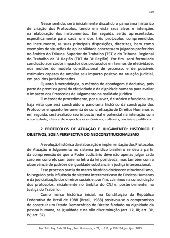 Rev. Trib. Reg. Trab. 3ª Reg., Belo Horizonte, v. 71, n. 111, p. 137-154, jan./jun. 2025139Nesse sentido, será inicialmente discutido o panorama histórico de criação dos Protocolos, tendo em vista seus alvos e intenções na elaboração dos instrumentos. Em seguida, serão apresentadas, especificamente para cada um dos três protocolos compreendidos no instrumento, as suas principais disposições, diretrizes, bem como exemplos de situações de aplicabilidade concreta em julgados proferidos no âmbito do Tribunal Superior do Trabalho (TST) e do Tribunal Regional do Trabalho da 3ª Região (TRT da 3ª Região). Por fim, será formulada conclusão acerca dos impactos dos protocolos em termos de efetividade, nos moldes do modelo constitucional de processo, e de possíveis estímulos capazes de ampliar seu impacto positivo na atuação judicial, em prol dos jurisdicionados.Quanto à metodologia, o método de abordagem é dedutivo, pois parte da premissa geral da efetividade e da dignidade humana para avaliar o impacto dos Protocolos de Julgamento na realidade jurídica.O método de procedimento, por sua vez, é histórico e funcionalista, haja vista que será construído o panorama histórico da construção dos Protocolos enquanto ferramenta de concretização de Direitos Humanos e, em seguida, será avaliado seu impacto real e potencial na interação com a sociedade, diante de aspectos econômicos, culturais, sociais e políticos2 PROTOCOLOS DE ATUAÇÃO E JULGAMENTO: HISTÓRICO E OBJETIVOS, SOB A PERSPECTIVA DO NEOCONSTITUCIONALISMOA evolução histórica da elaboração e implementação dos Protocolos de Atuação e Julgamento no sistema jurídico brasileiro se deu a partir da compreensão de que o Poder Judiciário deve não apenas julgar cada caso em concreto com base na letra da lei positivada, mas também com a observância de padrões de igualdade substancial e justiça interseccional.Esse processo partiu do marco histórico do Neoconstitucionalismo, foi seguido pela influência do sistema interamericano de Direitos Humanos e da judicialização dos direitos sociais e, por fim, culminou na consolidação dos protocolos, inicialmente no âmbito do CNJ e, posteriormente, na Justiça do Trabalho.Como marco histórico inicial, na Constituição da República Federativa do Brasil de 1988 (Brasil, 1988) positivou-se o compromisso de construir um Estado Democrático de Direito fundado na dignidade da pessoa humana, na igualdade e na não discriminação (art. 1º, III; art. 3º, IV; art. 5º).